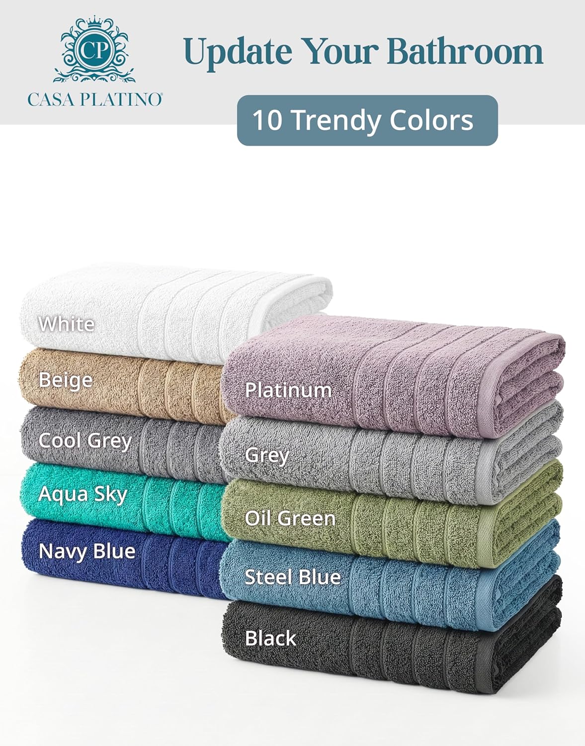 Wrap your everyday routine in comfort with the Casa Platino 24-Piece Premium Bathroom Towel Set, thoughtfully designed for softness, absorbency, and long-lasting performance. Crafted from 100% ring spun cotton terry, these towels feature a soft, high-GSM, medium-plush feel that absorbs water efficiently while remaining breathable and quick-drying. The complete set includes 2 oversized bath sheets, 2 bath towels, 2 gym towels, 6 hand towels, 4 fingertip towels, and 8 washcloths, offering a coordinated solution for family bathrooms, guest rooms, dorms, rentals, and whole-home use. Casa Platino towels are engineered with balanced cotton density to deliver a premium look without excessive weight. Reinforced hems enhance durability through frequent washing, while a low-lint terry weave helps maintain softness and absorbency over time with proper care. Inspired by hotel and spa quality, this versatile towel set combines practical sizing, dependable comfort, and easy maintenance for everyday bath, gym, and guest needs.
