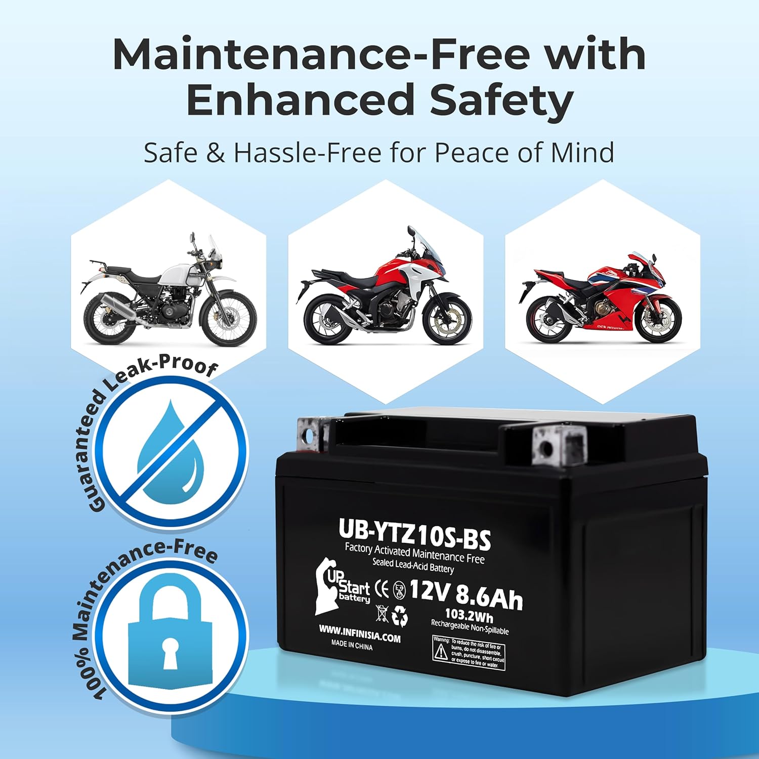 Designed for budget-conscious motorcycle riders who need a simple, no-fuss power solution, this rechargeable sealed battery delivers dependable performance right out of the box. With its pre-charged configuration, it gets your bike started immediately—no waiting or special preparation required. It’s a reliable replacement for those looking for a 2003 CBR600RR battery that offers consistent ignition power without added complexity.Maintenance-free and built for dependable use, this sealed, spill-proof battery is a smart alternative to more expensive OEM options. Whether you’re getting your bike ready for the road or looking for a dependable replacement, the secure, sealed design ensures safe handling and peace of mind during installation. It also functions well as a cost-effective CBR 600 F4i battery solution.Easy to install with no special tools required, it comes with mounting hardware and is straightforward to set up for most standard motorcycle configurations. Built for reliability, it’s a practical choice for riders who want strong starting power and simple installation.Always confirm compatibility with your specific motorcycle model before purchasing to ensure proper fit and performance. If you’re looking for a CBR600RR battery that balances value, reliability, and ease of use, this unit is ready to perform.Compatibility:2001 – 2016 Honda CBR600F4i, 600cc2005 – 2021 Honda CBR600RR, RA 600ccPlease note: This is an UpStart Battery brand replacement, not an OEM product.
