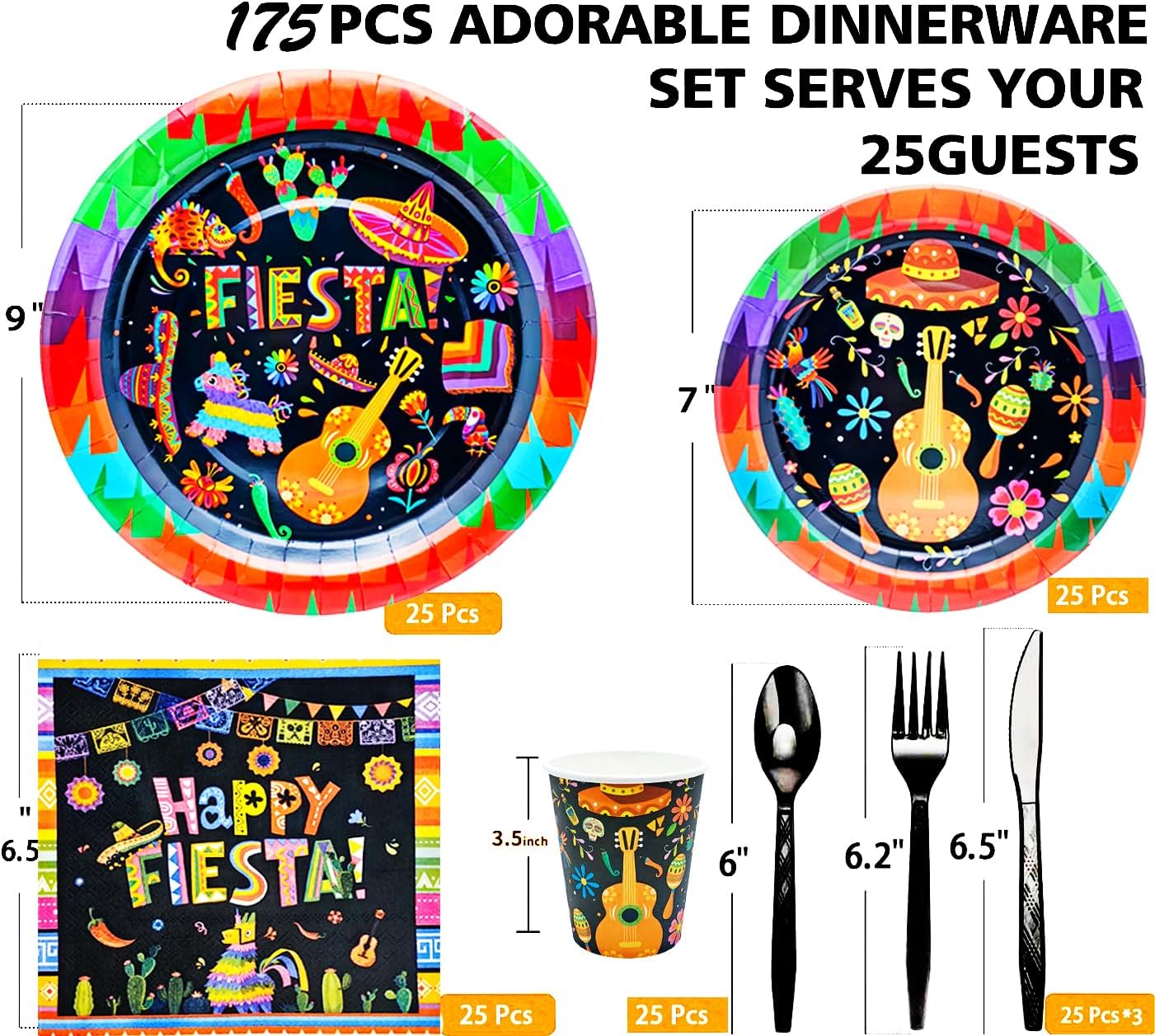【The package includes】: 9"fiesta paper plates X 25pcs, 7"fiesta dessert plates X 25pcs, 6.5" fiesta napkins X 25pcs, 6.2" forks X 25pcs, 6" spoons X 25pcs, 6.5" knives X 25pcs. 3.5" 9 Oz fiesta paper cups X 25pcs, 【High-quality materials】:All our fiesta-themed tableware are made of high-quality paper,heat-resistant and durable.The patterns and colors are well-printed and do not fade,providing you with a party full of fiesta- themed atmosphere. 【QUICK AND EASY CLEAN UP】:These fiesta party decorations can save clean up,when you're done with the tableware,just throw away the food scraps along with the tableware,save your time, just spend motime enjoying your partyre ! 【Satisfied Experience】: If you Have any Questions about this product,please contact us.Your satisfaction are our goals,We will reply in 24 hours to solve the problem.