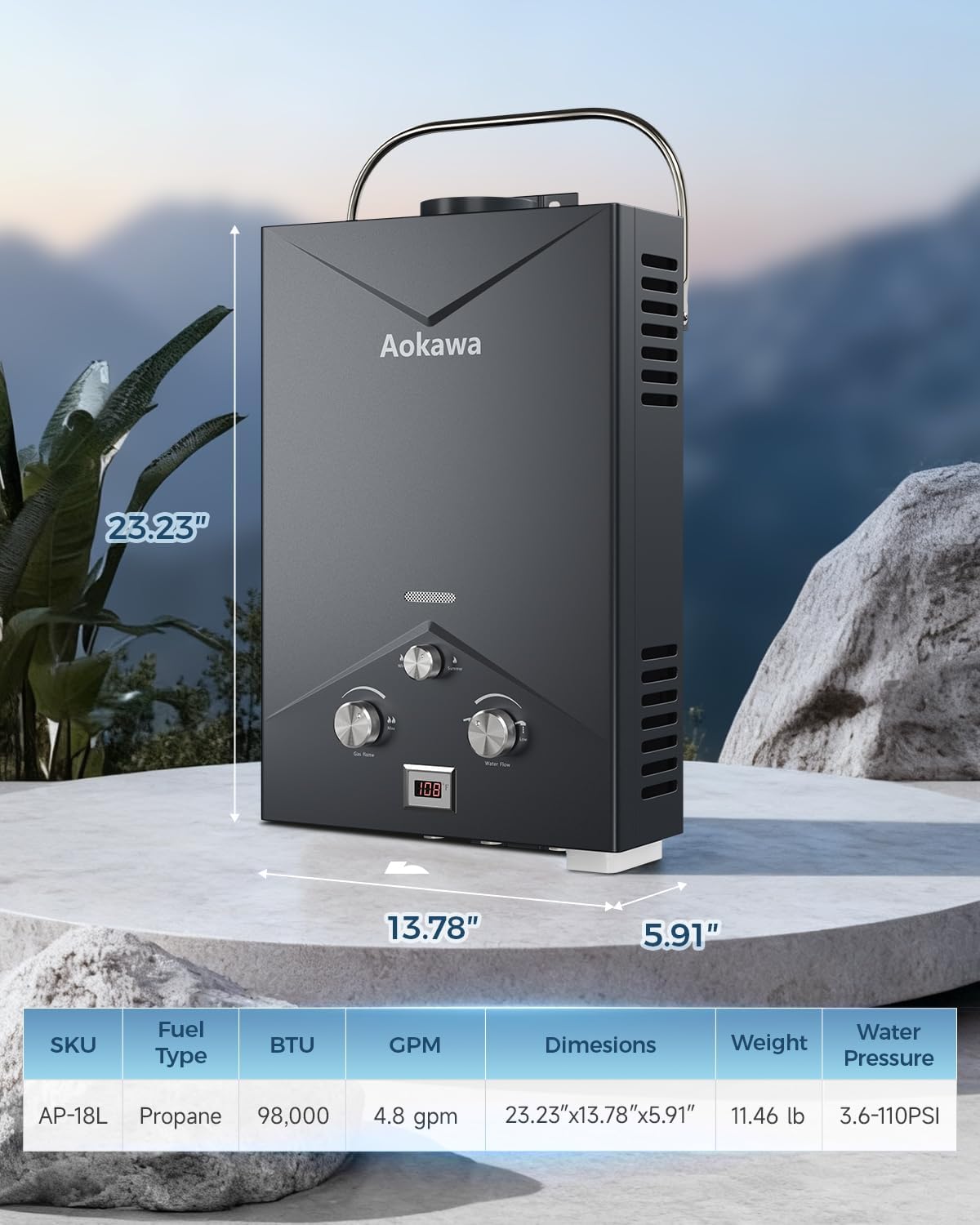 High-capacity 18L portable propane tankless water heater with 4.8–5.0 GPM fast heating, perfect for RVs, cabins, large outdoor showers, and off-grid applications.