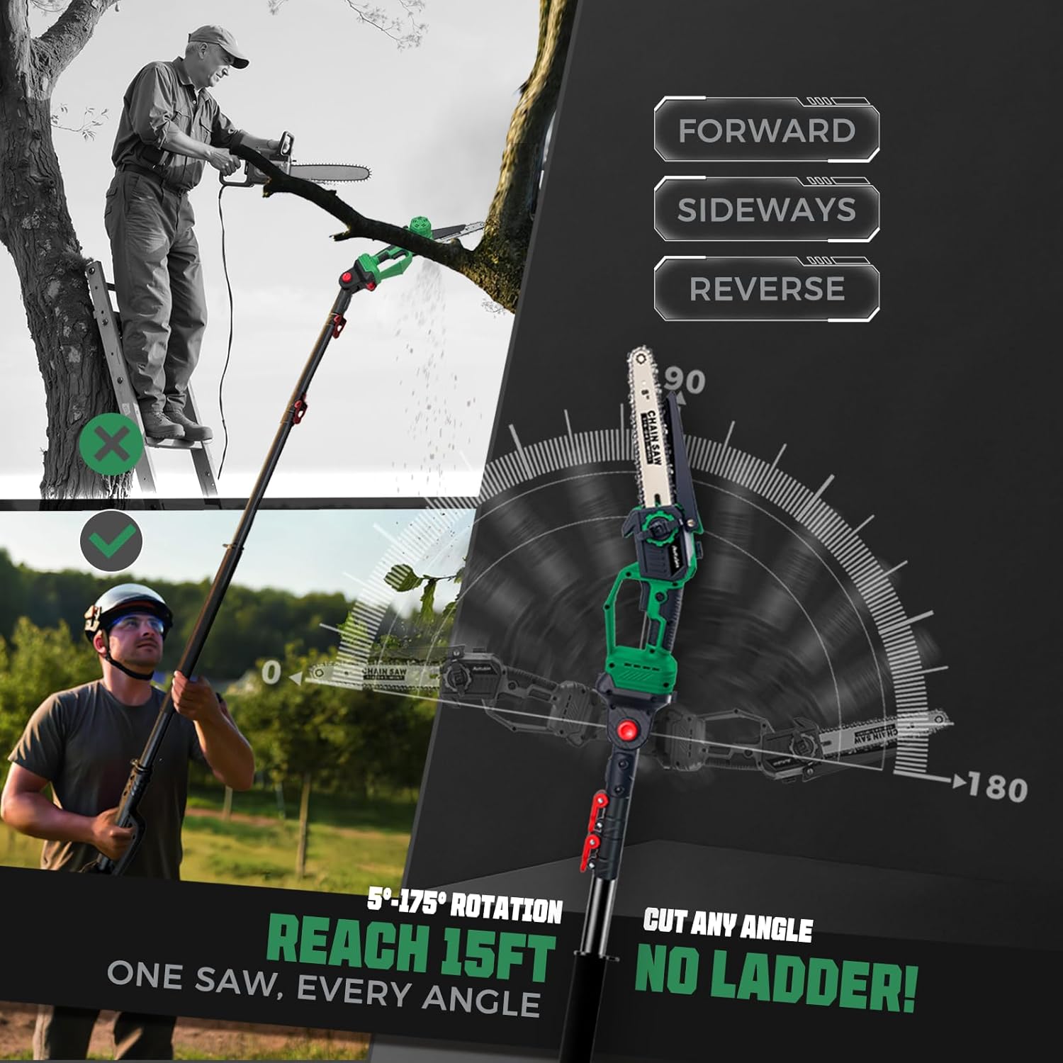 | Included Components | 1x 8 Inch Chainsaw, 1x Telescopic Pole, 1x Goggle, 1x Manual Instruction, 3x Chain (One has been installed),1x Chain Protective Sleeve, 1x Pole Shoulder Belt, 1x Anti-Slip Glove ,2 x 4000mAh Batteries, 1* Fast Charger |