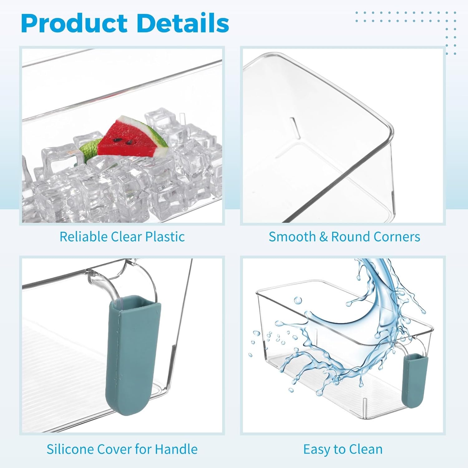 Color: Cyan Material: Plastic Size: Ice Bin Size: 12.2 x 6.9 x 4.3 in, 12.2 x 4.9 x 4.3 in Package Includes: 2 x Ice Bin with Scoop and Tong Note: - Please refer to the measurement. Tiny measuring error is allowable in normal range. - There might be a little color difference due to the monitor, camera or other factors, please refer to the physical item.