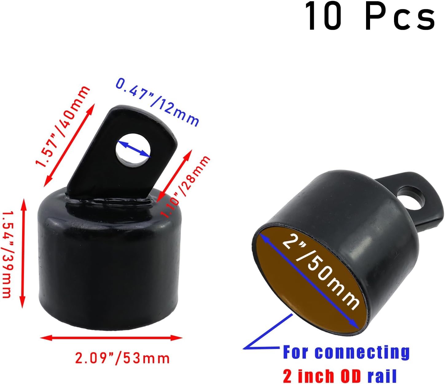 Features: Material: Iron. Size: Top Rail End suits for 2" Outer Diameter rail. Product Description: Chain link rail end cap suitable for connecting rail to post. Perfect repair for the broken top rail end. Tool-free installation with simple manual pressing. Package Includes: 10 Pcs Black Chain Link Fence End Caps. Note: Due to the manual measurement,there may be small deviations. Due to different displays, the actual color may be slightly different from the picture.