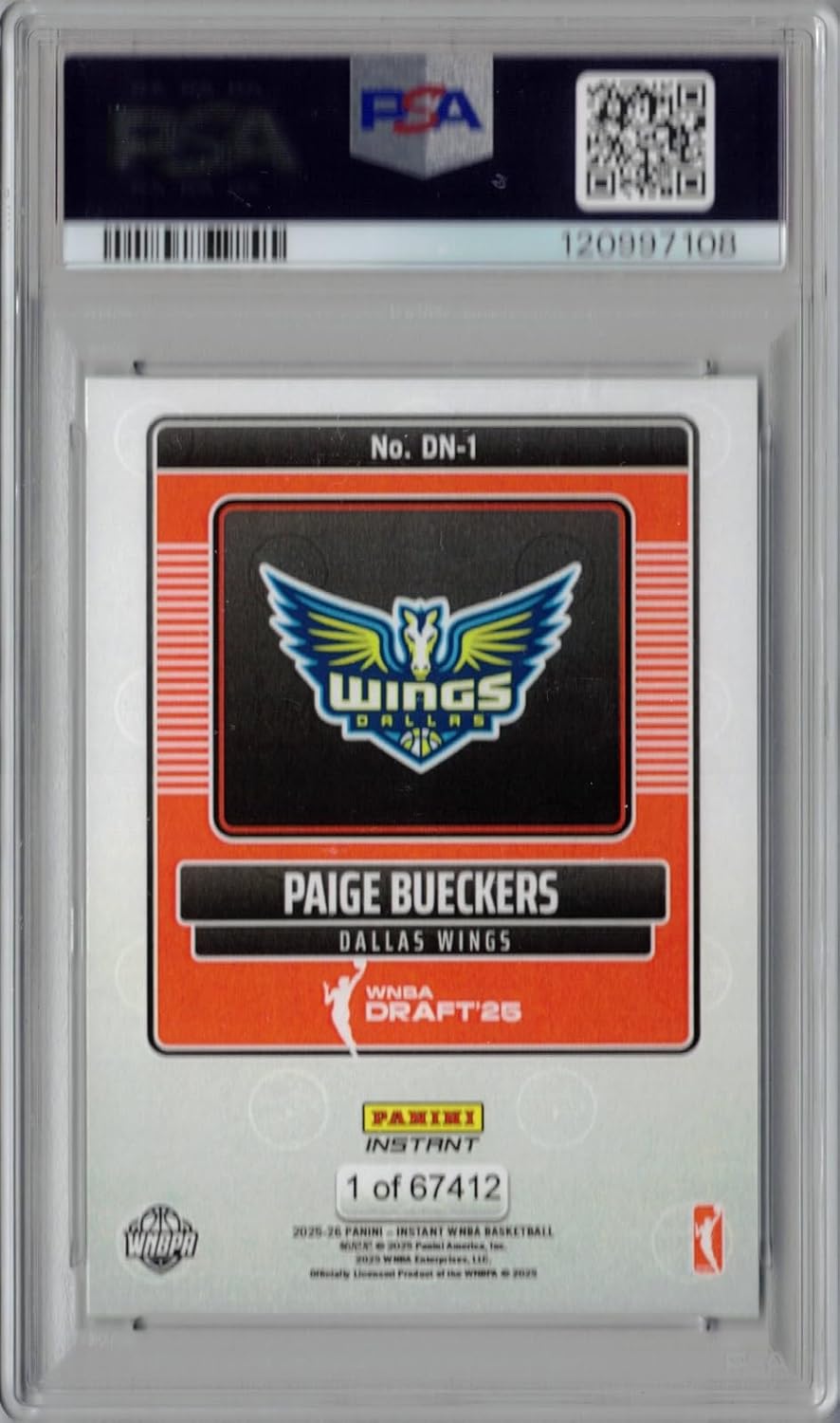 2025 Panini Instant Draft Night WNBA Basketball #DN-1 Paige Bueckers Rookie Card Graded PSA 9 Mint. This is an original, authentic Paige Bueckers basketball card produced by Panini in 2025. In the upper left corner region of the card you will see the official RC logo, indicating that this is a true Rookie Card. In addition, this card is numbered on the back '1 of 67412', meaning 67,412 of these cards were produced, and this one is graded PSA 9 Mint! Please note: All 67,412 of these cards have '1 of 67412' on the back, so this card isn't necessarily the first one that was made. Still a limited and special card, especially considering this one is graded PSA 9 Mint. Stock photo shown. Centering may vary.