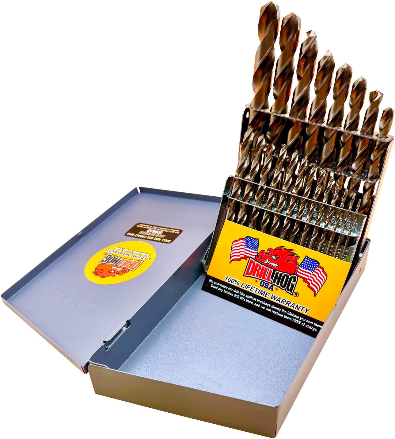 Drill Hog is proud to release the newest technology in drill bits. These bits are made from Cobalt steel which has a melting point of 2723 Fahrenheit! These bits will drill through the toughest steel like truck frames, stainless steel, farm implements, spring steel, grade 8 bolts, and more! This set is known as the "Mechanics Set" because it contains the most popular sizes. Proudly made by Drill Hog USA.