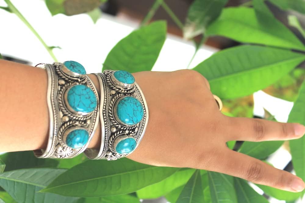 Beautiful Tibetan style bangle from Nepal. This beautiful Bohemian piece has an ornately designed band with engraved "shells" on the band, with 3 eye-catching stabilized-Turquoise stones. It goes with any style and makes the perfect gift idea. It is adjustable to fit any wrist size. This unique piece comes with a cute Nepalese jewelry pouch for storage. Perfect present for mom, dad, grandmom, grandad, or anyone you want to surprise. - DISCLOSURE: Bracelet will turn some wrists green.