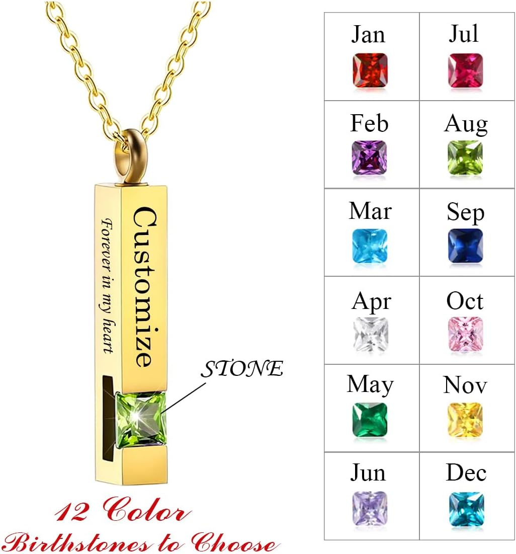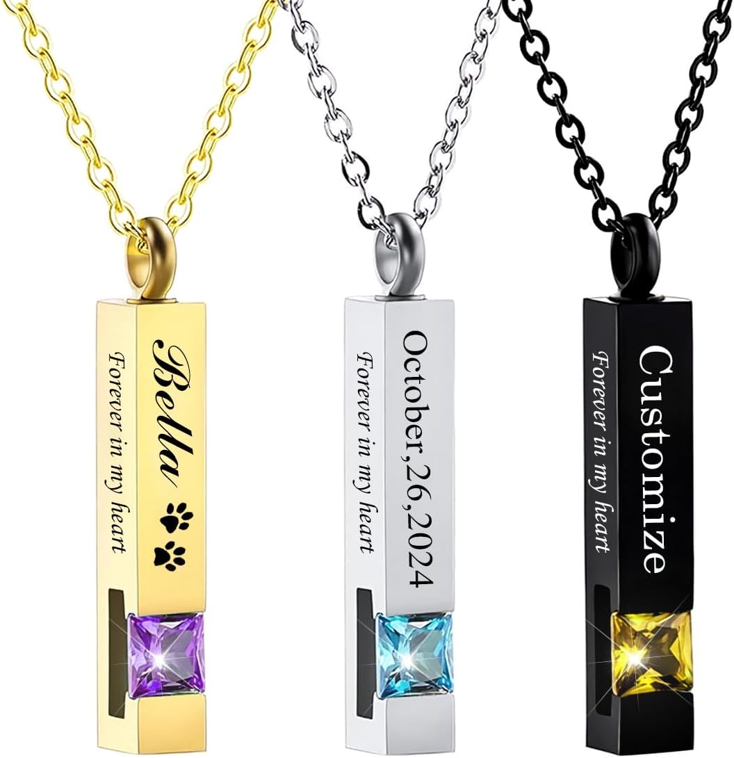 Losing a loved one is an emotional journey, and our Crystal Cremation Urn Jewelry Cube Memorial Ashes Necklace Pendant is here to help you honor their memory, this necklace is expertly crafted to provide comfort and solace during difficult times. The pendant is designed in a cube shape, symbolizing strength and stability. It measures 19.6 inches in length and 0.98 inches in width, making it a delicate and meaningful piece of jewelry. Our urn necklace is made of high-quality stainless steel, ensuring its durability and resistance to tarnish. It can hold a small amount of ashes, allowing you to keep a part of your loved one with you wherever you go. By wearing this necklace, it gives you a sense of closeness and keeps their memory alive. What sets this necklace apart is its customizable design. With a variety of birthstone colors to choose from, you can select the one that represents your loved one's birth month or simply resonates with you. Whether it's a name, a date, or a special message, the customization options make this necklace truly unique and meaningful. Filling the pendant with ashes is a simple and straightforward process. Just unscrew the pendant, use the provided funnel and small steel needle to carefully pour in the ashes, and then tighten the screw. To make gift-giving easier, each necklace comes in an elegant gift box. It eliminates the need to search for a separate gift box, allowing you to present this special necklace to someone who could use a heartfelt gesture during their grieving process.