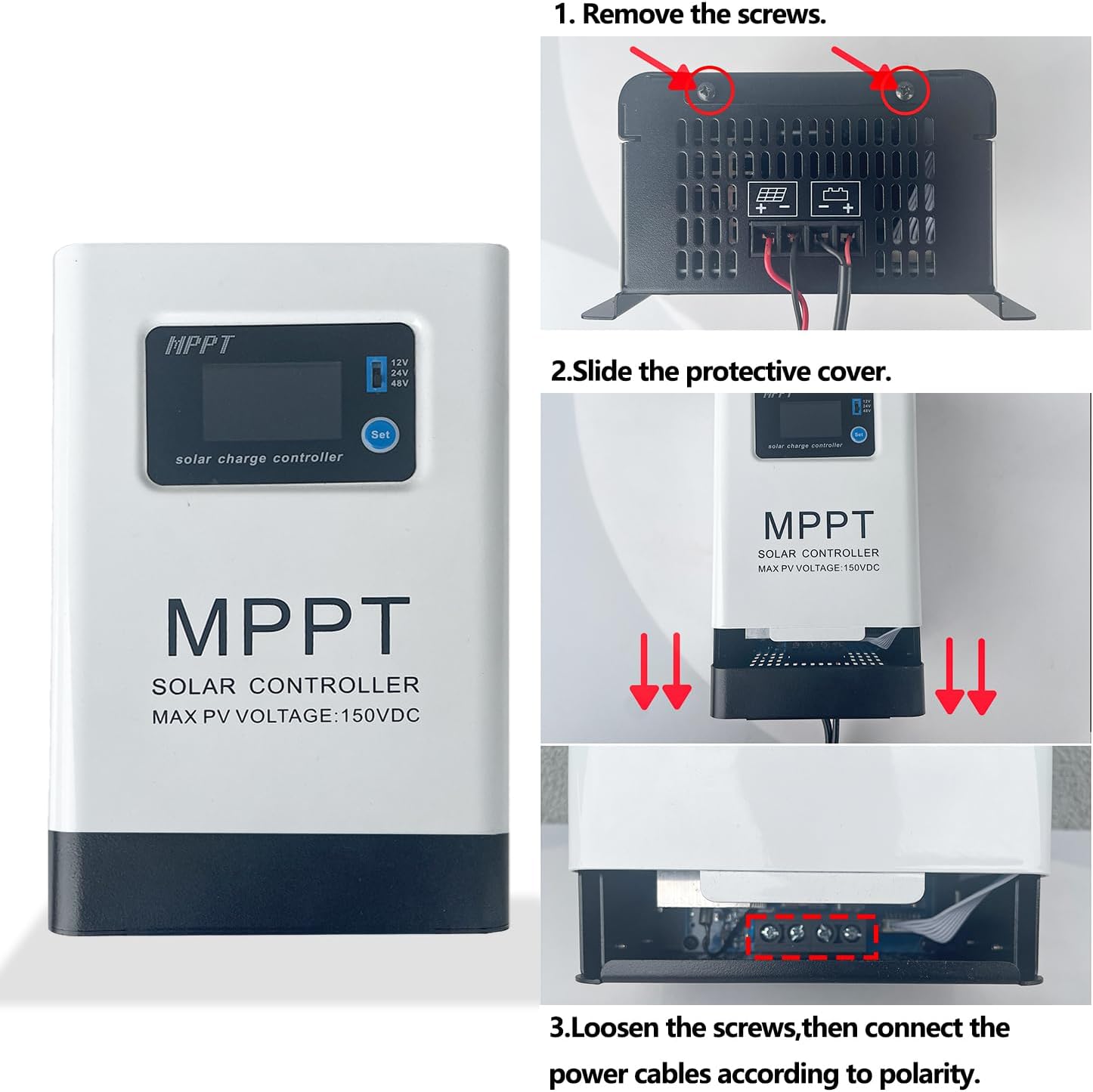 This MPPT solar charge controller is designed to maximize the efficiency of your solar power system, delivering reliable and stable charging performance for RVs, off-grid homes, and large-scale solar installations. With a wide PV input voltage range of 18-150V DC and flexible 12V/24V/48V battery compatibility, it works seamlessly with most common solar panels and battery types (including lithium, SLA, gel, and AGM batteries). Key Features High-Efficiency MPPT Technology: Advanced maximum power point tracking algorithm ensures up to 99% charging efficiency, extracting maximum power from your solar panels even in low-light conditions. Wide PV Input Range: Supports 18-150V DC PV input, compatible with a broad range of solar panel configurations for large off-grid systems. Battery Compatibility: Works with all common battery types (lithium, lead-acid, SLA, gel, AGM). Intelligent Protection System: Built-in over-load, polarity reverse, over-charging, and over-temperature protections to safeguard your system and devices. Smart Cooling System: Temperature-controlled intelligent cooling fan automatically adjusts speed to maintain optimal operating temperature, extending component lifespan. Full-Color LCD Display: Clear multifunctional LCD screen shows real-time data (PV voltage, charging current, battery voltage, power, temperature, and battery status) for easy monitoring. User-Friendly Controls: Simple operation for battery type switching and voltage adjustment. Specifications Model: 60A / 100A PV Input Voltage: 18-150V DC Battery System: 12V/24V/48V (switchable) Max Charging Current: 60A / 100A Cooling: Intelligent temperature-controlled fan Display: Full-color LCD multifunctional screen Applications Perfect for: RVs, campers, and trailers Off-grid cabins and tiny homes Large solar power systems Remote industrial and agricultural installations Marine and boat solar setups Why Choose This MPPT Solar Charge Controller? Reliable Performance: High-quality chips ensure stable output and protect your electrical appliances. Durable Design: Robust construction with intelligent cooling for long-term use in harsh environments. Easy Installation: Clear terminal labeling (PV panel input / battery charge) simplifies setup. Comprehensive Safety: Multiple protection features prevent damage from reverse polarity, overload, overcharging, and overheating.