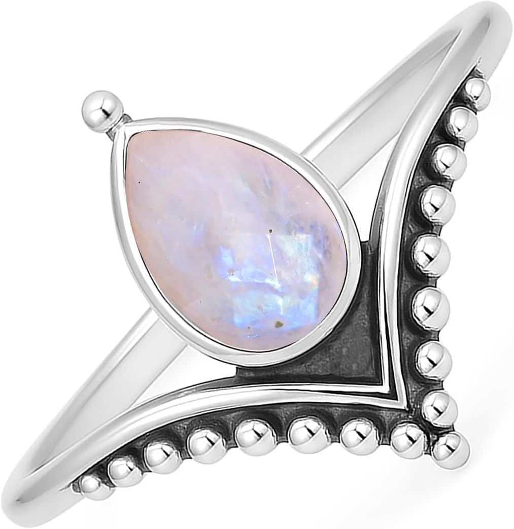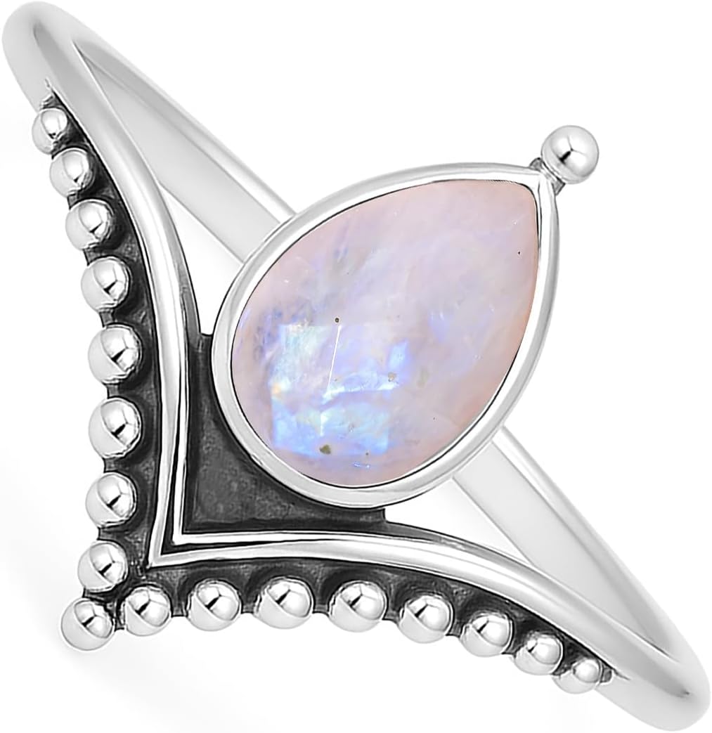 Elevate your style with this handcrafted 925 Sterling Silver Moonstone Chevron Ring – a perfect fusion of elegance and earthy charm. At its center is a mesmerizing teardrop-shaped rainbow moonstone, known for its enchanting adularescence that glows with a celestial blue sheen. Designed with a sleek chevron silhouette, the ring is adorned with dotted silver bead detailing that adds a vintage flair. The oxidized finish enhances the contrast and brings out the ring’s handcrafted textures. Whether worn alone or stacked with other rings, this boho-inspired design offers a striking statement for any occasion. This ring is more than just jewelry – it's a celebration of feminine energy and natural beauty. Handcrafted by skilled artisans using ethically sourced materials, it makes a meaningful gift for birthdays, spiritual milestones, or just because.