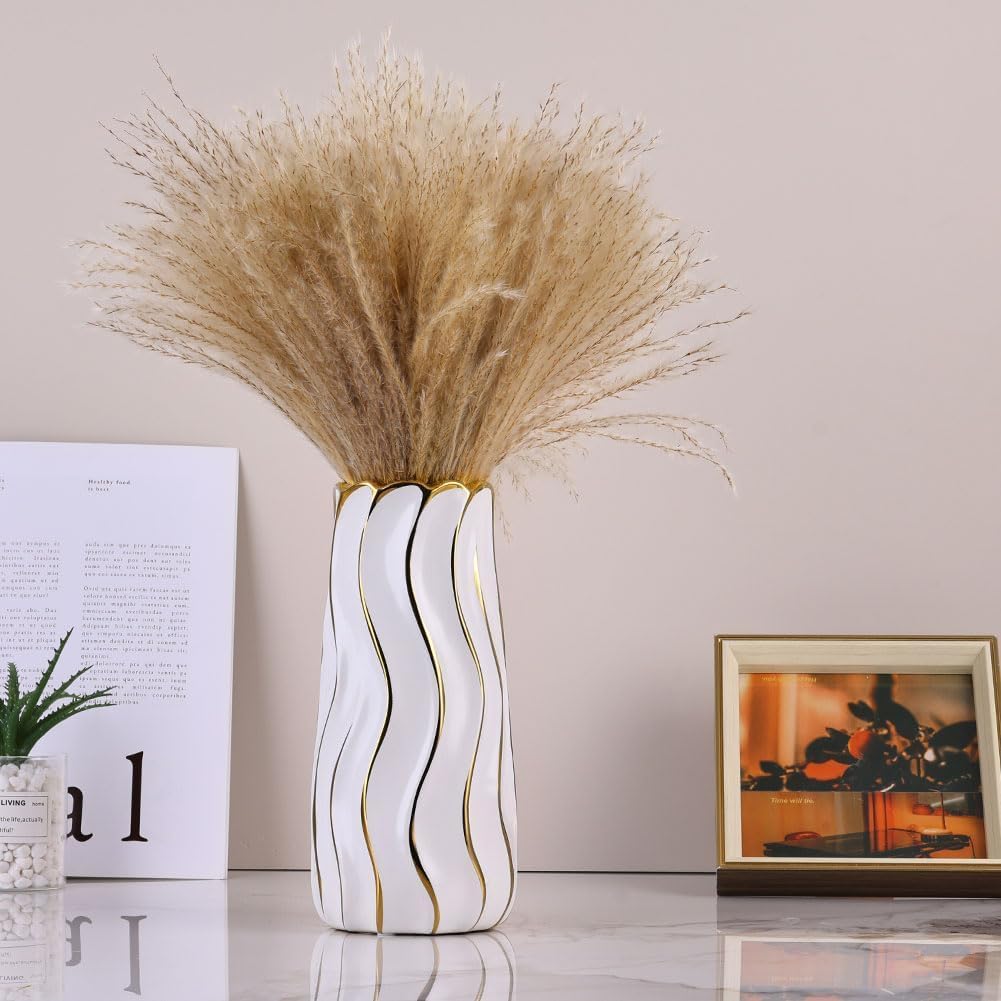 Elevate your home decor with this beautifully crafted medium-sized white ceramic vase, standing at 9.5 inches tall. With a clean white finish adorned with luxurious gold accents, this vase is designed to be a focal point in any room. Measuring 4.3 inches wide, it fits perfectly on tables, shelves, and mantels, making it a versatile addition to your decor collection.The generous 3.8-inch opening allows for a variety of floral arrangements, whether you prefer fresh flowers, dried botanicals, or greenery like eucalyptus and pampas grass. This vase not only enhances the beauty of your floral displays but also serves as a stunning standalone decoration that adds elegance to your space.Perfect for modern minimalism or Bohemian chic, this vase complements various design styles, bringing warmth and sophistication to your living room, entryway, or bedroom. Whether you're hosting a special event, decorating for a wedding, or refreshing your home decor, this elegant vase is the perfect choice to add a luxurious touch.