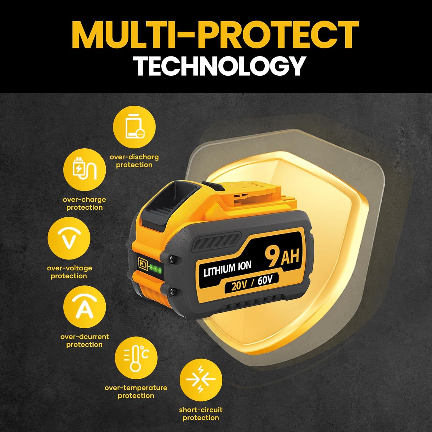 Unlock powerful performance and extended runtime with this 9Ah dual-voltage lithium-ion replacement battery compatible with DeWalt cordless power tools. Engineered for high-demand applications, the high-capacity design helps reduce downtime caused by frequent recharging. Featuring dual-voltage flexible technology, this battery automatically adjusts to support compatible with DeWalt 20V and 60V tools, delivering optimal power output without manual switching. Easily move between tools while maintaining consistent and reliable performance. Designed with a durable housing and advanced battery protection system, this replacement battery provides stable power delivery and long service life even in demanding jobsite conditions. A built-in LED fuel gauge allows quick monitoring of charge levels, helping you stay productive and avoid unexpected interruptions. Note: When used with 60V tools, the battery operates at 3.0Ah capacity. When used with 20V tools, it delivers the full 9.0Ah capacity, offering versatility and extended runtime in one battery solution.