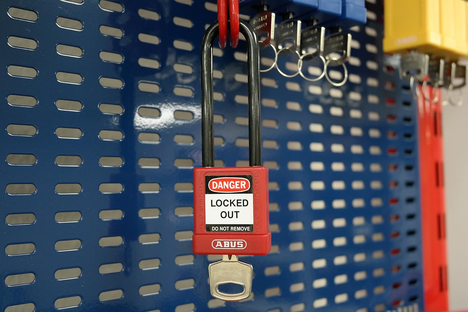 Product Description Lockout Padlock, Key Type Different, Body Material Aluminum, Shackle Dia. 1/4 In., Shackle Height 1-1/2 In., Shackle Material Plastic Encased Steel, Shackle Width 3/4 In., Body Width 1-1/2 In., Body Thickness 51/64 In., Legend Danger Locked Out, Bumper Color Red, Includes English, Spanish, French Lockout Labels, Standards OSHA, Minimum 70 Percent Post-Consumer Recycled Content, UL Environment Claims Validation, Body Height 1-3/4 In., Body Color Red, Shackle Type Open, Number of Keys 1 From the Manufacturer ABUS Non-Conductive 74 Series is lightweight, non-magnetic, non-sparking and dielectric, perfect for LOTO.