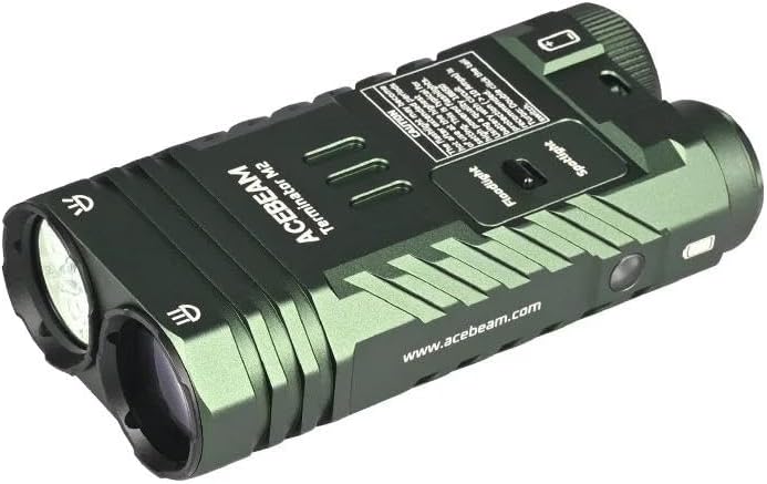 Acebeam Terminator M2 Dual Head Spot/Flood EDC Flashlight - OD Green 3200 Lumen, 6500KAcebeam Terminator M2 is a multi source EDC flashlight that meets the requirements of a spotlight, floodlight, and auxiliary light. There are also some multi-funct al modes: seven-color light automatic cycle mode, RGB lights, signal lights, and red SOS. Powered by USB-C battery (included). The battery is replaceable, so with the M2, you're ready for any situat .Opt 1: OD Green ( This listing)Multi light sources: 1x Spotlight LED, 1x AUX Light, 3x Floodlight Cool White 6500K LEDsFloodlight Max Output: 3200lumens, 178metersSpotlight Max Output: 500meters, 62500cd, 900lumensOne spotlight mode plus four brightness levels of floodlight to cycleAUX light modes for opt s: Seven-color automatic cycle, Red, Green, Blue, Green-Signal Light, Red-SOSEasy to switch light sources or brightness modes to meet different applicat s.Powered by one Acebeam Li- Battery with built-in USB-C port (Included)Temperature Control system: keeps light from overheating so it can run brighter and longerTail stand capabilityImpact resistance: 1.5mWaterproof: IP68, underwater 2mSpecificat s:Size: (Length) 95.4mm / 3.76'' x (Head) 48.5mm / 1.91 '' x (Body) 29mm / 1.14''Weight: 201.1g (7.09oz.) w/ battery ...