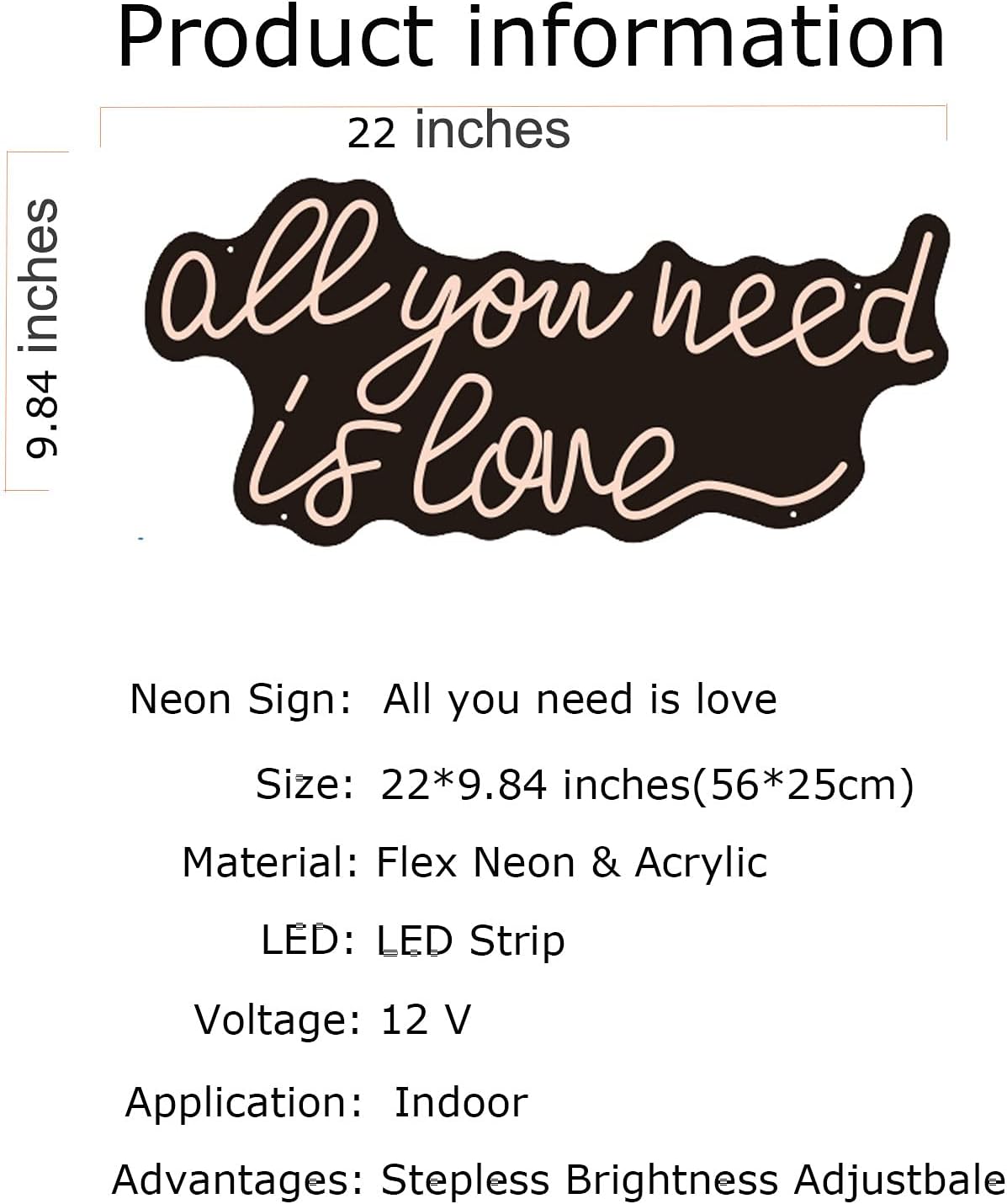 Sign Letter: All You Need is Love Color: Blue/PinkBacking material: Acrylic Backing color: Transparent Installation method: Hanging OR Mount This is a flex LED Neon sign, having the same effect as a real glass neon sign, LED neon is completely safe and non-frangible. Includes:- 1 Neon Sign - 12V Power adapter (AC110-240V) - Plug ( depends on destination ) - Chain & Screws Note:* There is a protect film at the back of the acrylic, pls remove it before using if you want a transparent backing