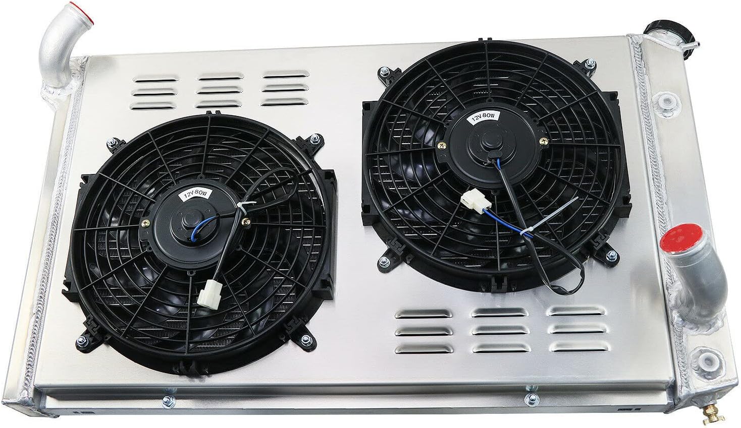 Package Include:1 X 3 Row ;AA5052 Aluminum Radiator1 X CNC Machined Radiator Cap1 X AA5052 Aluminum Shroud2 X 12" Fans (Includes mounting kits)1 X Thermostat Relay Kit Radiator Size:Condition:NewHigh Performance Racing Spec.3 Row of tubes Core Racing DesignPetock Drain:OEM style brass petcock drainCore Size: 27 1/2" Width x 16 3/4" Height Overall Size: 33 1/2" Width x 19 1/2" HeightUpper Inlet: 1 1/2" located on the driver sideLower Outlet: 1 3/4" located on the passenger sideTransmission Oil Cooler: G1/4(Z)Please Check the Size Before You Buy! Vehicle FitmentFor 1973-1976 Chevy Corvette Base Stingray V8 5.7L 7.4L FANS:Volt :12vMaximum Fan CFM: 1730 cfmFan Diameter (in): 12.050”Thickness (in): 2.500”Number of Blades: 10 bladesMaximum Fan RPM: 2,250 rpmBlade Material: PlasticAmp Draw: 12.70 ampsIncludes the Mounting Tabs for an Easy Zip Tie Installation Thermostat Kit:Universal fit for any automotive vehicle and electric fan.Activates by grounding electric fans at preset temperature.180'F turn-on temperature, 165'F turn-off temperature.Probe typically threads into radiator, water outlet or manifold.RED + connect directly to battery.WHITE wire to ignition switch power source.BLACK goes to thermos switch.BLUE wire goes to the Fans.