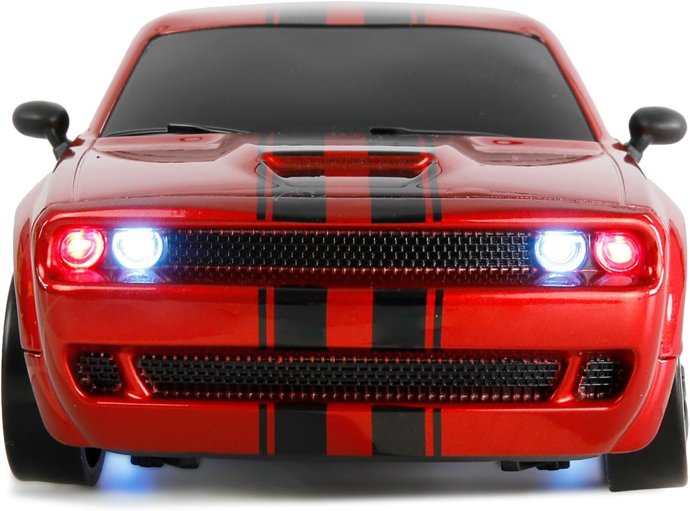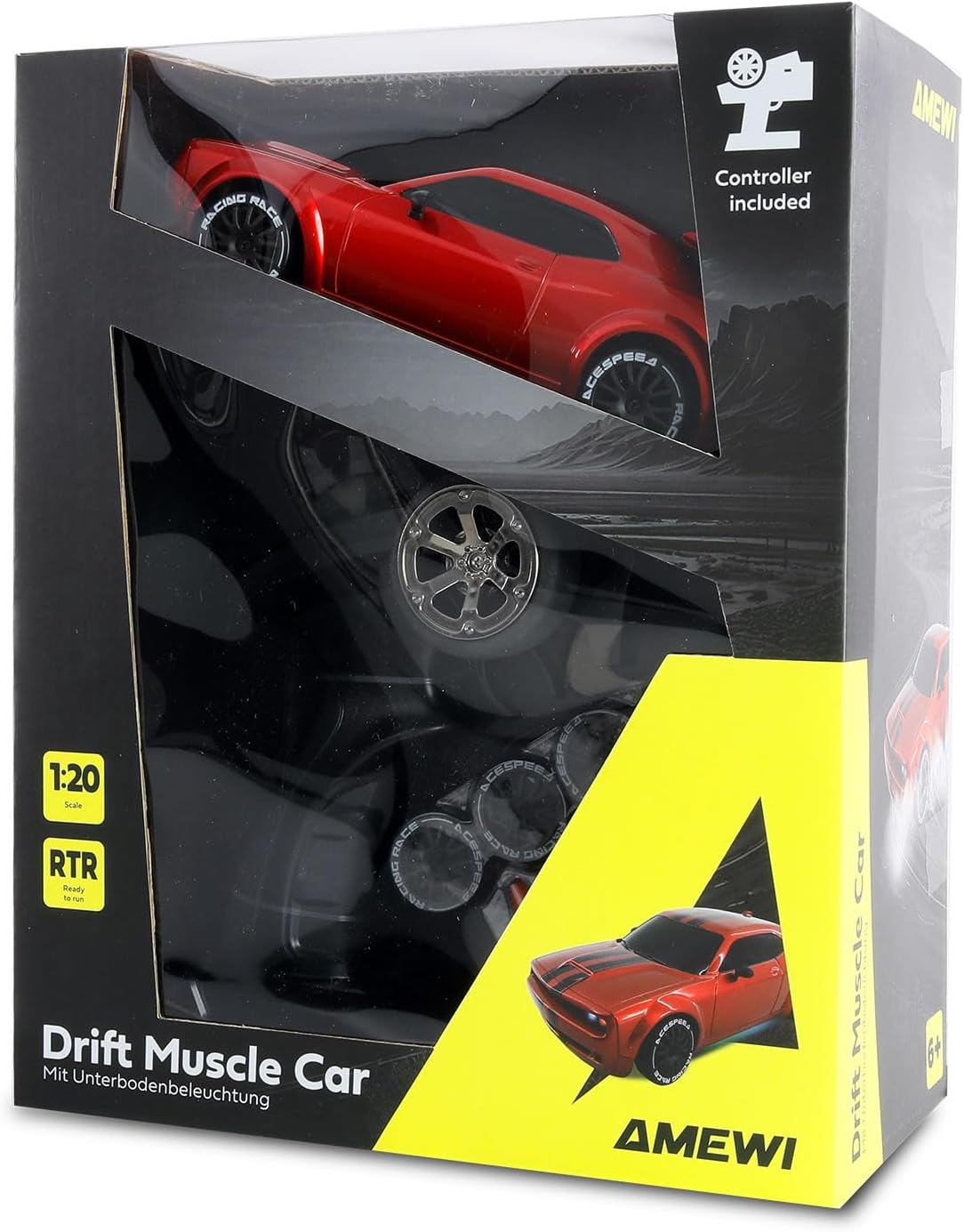 The remote controlled Drift Muscle Car in 1:20 scale offers maximum performance and spectacular show effects: the switchable underbody lighting with three colours and seven modes is particularly noticeable, which gives the vehicle a unique look, and provides impressive effects especially when drifting at dusk or dark. The precise proportional control of gas and steering allows sensitive manoeuvres and realistic driving style that significantly increases the fun. Another plus for beginners is the gyro stabilisation that can be regulated via the remote control, which reliably keeps the vehicle in the drift and thus allows quick learning success. As an RTR version (ready-to-run), the Drift Muscle Car is ready to use. Included are an ergonomic pistol remote control, a powerful Li-ion battery with up to 20 minutes driving time and the matching USB charging cable. The switchable LED lights on the front and rear ensure good visibility. The powerful four-wheel drive (4WD) guarantees the best traction and control in any situation. Drift wheels with hard plastic tyres are already installed for cool drifts, in addition, wheels with rubber tyres are included for classic on-road use - so the vehicle can be flexibly adjusted. The interference-free 2.4GHz remote control ensures a stable connection without interference and allows multiple pilots to drive simultaneously without frequency overlap. The top speed of up to 20 km/h can be continuously adjusted via the transmitter to optimally adapt it to driving skills and the environment. The trim of the front wheels can also be adjusted directly via the remote control to ensure a perfect straight run. Six pylons are included in the set and allow you to quickly set up your own drift track.