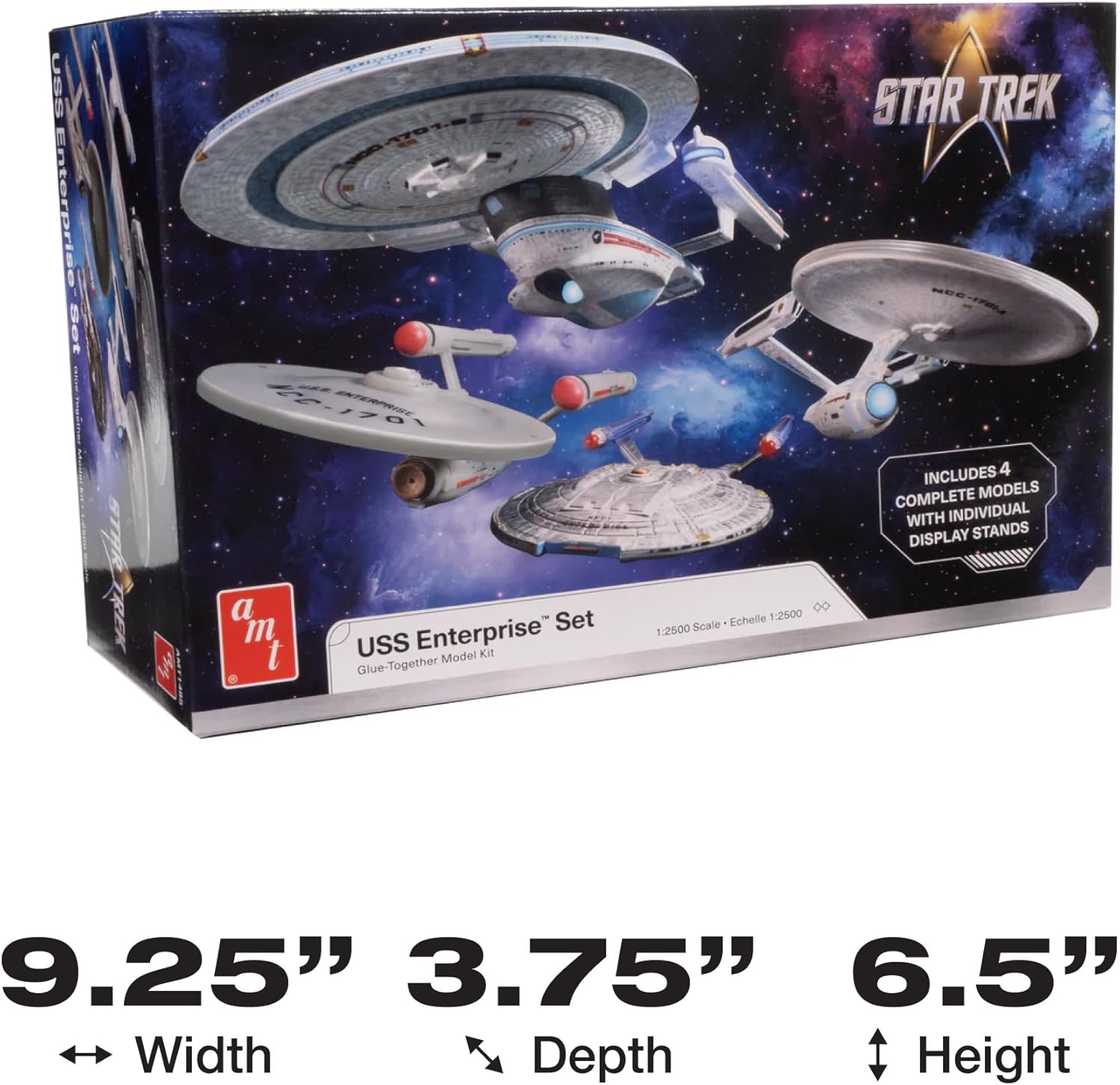 The AMT U.S.S. Enterprise Four Ship Set 1/2500 Scale Model Kit (Skill Level 2) includes four iconic Star Trek ships molded in white plastic. It requires paint and glue, making it suitable for intermediate model builders.