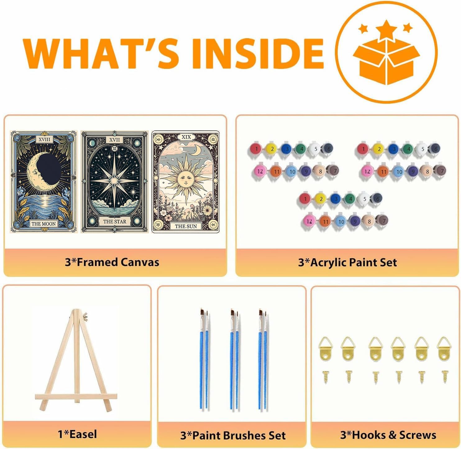 | Included Components | 6 different size paint brushes 3 description 3 set of acrylic paint 3 hook&screw 1 easel |
