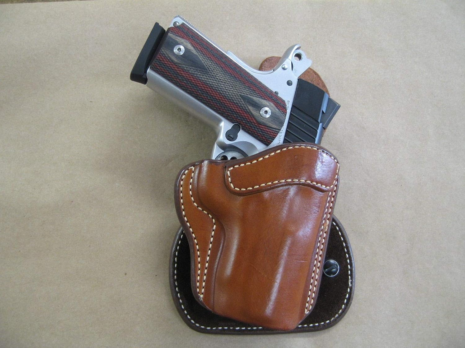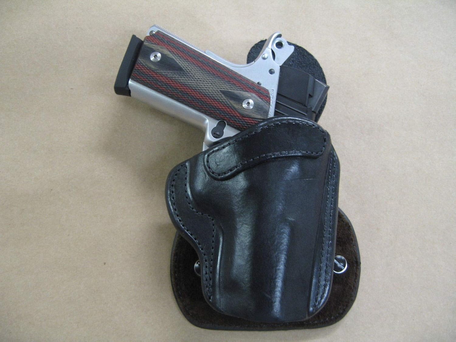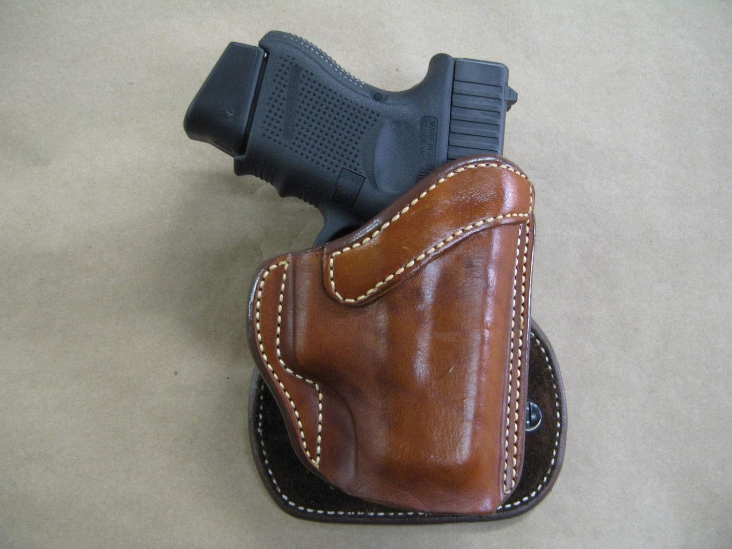 Azula All Leather Paddle Gun Holsters are a custom leather Outside the Waist Band OWB Paddle holster for Glock 19, 19X, 45, 23, 32 Pistol. Hand crafted from top quality leather to last a lifetime. The Azula All Leather Paddle holster is designed to be worn on the hip and can easily be inserted or removed without taking off your belt in seconds. The back of the holster covers the top of the pistol slide with a full COMFORT SHIELD so it does not dig into you for additional comfort that is not found in many other holsters. Azula All Leather Paddle holsters are a full length holster that covers the pistol completely so your front sight does not hang down below the holster. The Azula Paddle is made completely from top grain leather so it conforms to your body for all day wearing comfort. The All Leather Azula paddle is far more comfortable than a plastic paddle. The Azula Paddle holster has three secure tabs to lock in the holster to your waistline for a fast and easy draw. Azula Gun Holsters are hand made by master craftsman with over 30 years of holster making experience. Azula Gun Holsters have a lifetime replacement warranty and our Azula Leather gun belts match the Azula All Leather Paddle Holster. We offer the Azula leather belts up to size 58. This is a RIGHT HANDED TAN leather holster. AUCTION IS FOR HOLSTER ONLY - BELT SOLD SEPARATELY.