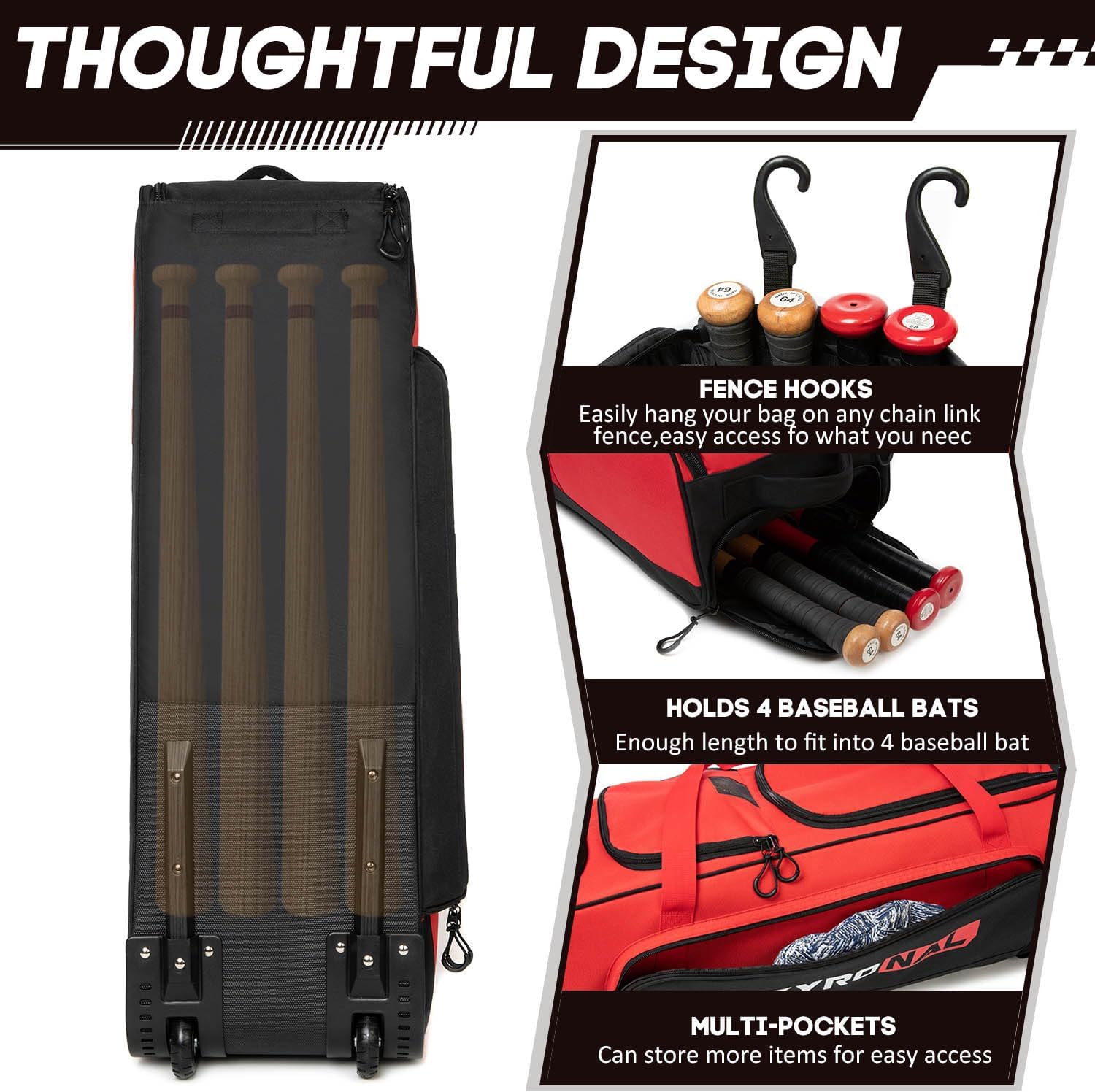 TYRONAL Rolling Baseball Bag with Wheels for 4 Bats :This roller baseball bag desgin one deep pocket to hold 4 bats (up to 34"), interior fence hooks for hanging, multiple functional pockets and compartments for gloves, shoes, helmet, face mask and clothing, padded handles and rollers for effortless transportation. Its sturdy 600D Nylon construction ensures durability, while the smooth zipper ensure long-lasting usage.The bottom is supported by a strong and wear-resistant material to prevent wear and tear.Designed to accommodate players of all ages, this wheeled baseball equipment bag lets baseball, softball and tee-ball players easily carry all of their gear in one bag.