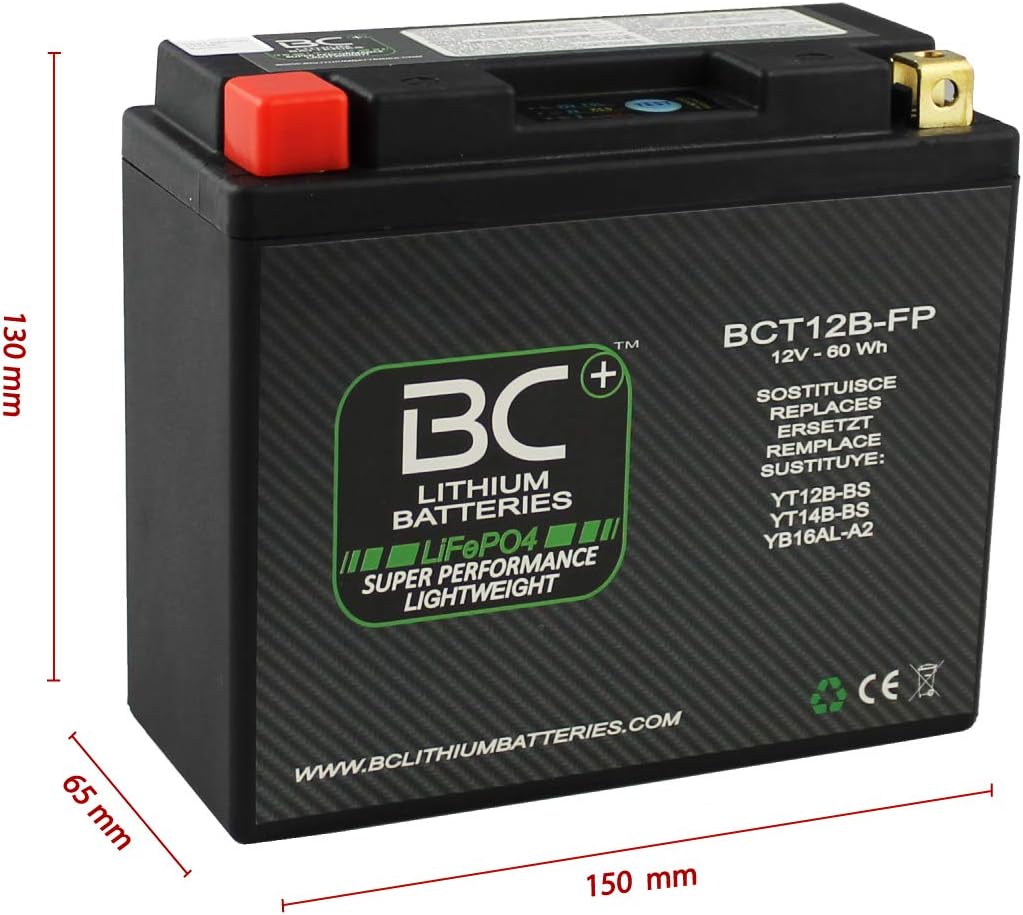 The BC Lithium Batteries BCT12B-FP is a 12V 5Ah LiFePO4 motorcycle battery engineered for reliability, safety, and long-lasting performance. Featuring advanced lithium iron phosphate technology, it provides stable voltage, fast recharging, and consistent power delivery across a variety of conditions. This battery integrates a Battery Management System (BMS) to prevent overcharging, short circuits, and overheating while ensuring optimal charge balance. The LED charge indicator allows quick status checks, making it easy to monitor your battery health. Weighing up to 80% less than comparable lead-acid batteries, it offers superior handling and easier installation. Designed to replace models like YT12B-BS, YT14B-BS, and YB16AL-A2, it fits motorcycles from brands such as Ducati, Yamaha, Suzuki, Benelli, and Triumph. Environmentally friendly and non-toxic, the BCT12B-FP contains no acids or heavy metals and poses no risk of acid leaks. It’s an ideal power source for motorcycles, ATVs, and other power sport vehicles requiring a compact, efficient, and dependable lithium battery. Every unit includes a protective cap, terminal screws, and installation manual for quick, straightforward setup. Whether you’re upgrading for performance, durability, or safety, BC Lithium Batteries deliver premium energy solutions trusted by riders worldwide.