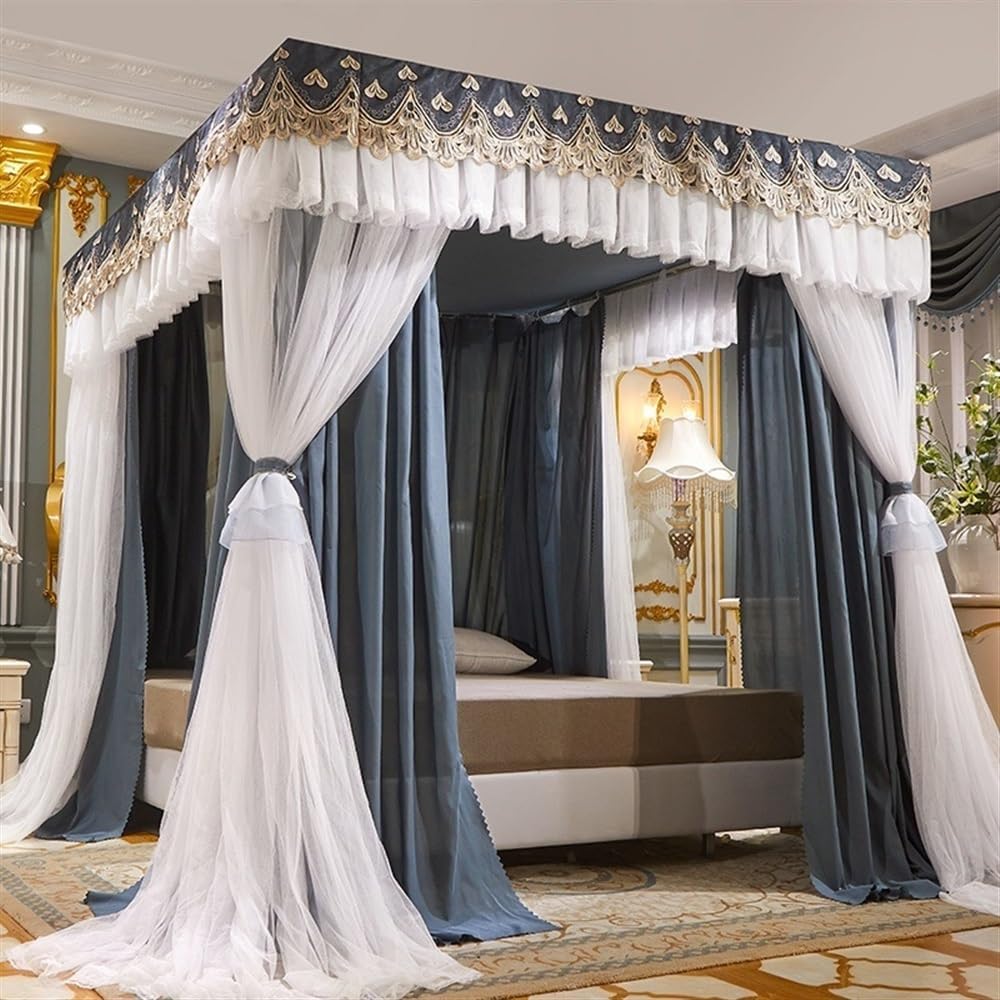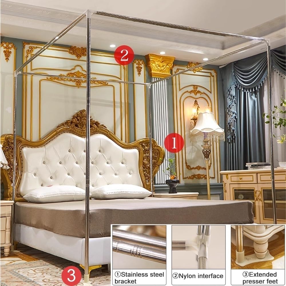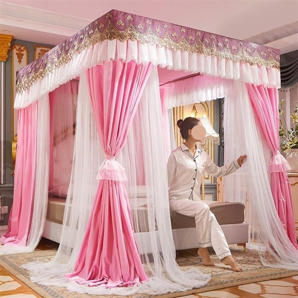 Experience a blend of romantic and practicality with our all-season bed curtains. Featuring a beautiful embroidery and ruffle design, the stylish lace top and full wraparound curtains provide complete privacy, while the double-layer structure combines a sturdy polyester fabric with a breathable mosquito net for ultimate comfort and protection. Suitable for year-round use, this bed canopy creates a serene and private space for rest.Designed with convenience in mind, the canopy offers a three-door overlapping interface for easy entry and exit, without compromising your personal space. The detachable steel pipe frame ensures portability, making it simple to disassemble and carry the set for use in different rooms or during travel.With its reinforced structure and five-way joint, the frame is stabilized by a presser foot at the base, ensuring that the canopy is securely anchored to the bed legs. This bed curtain not only adds romantic to any bedroom but also offers stability and functionality, making it a versatile addition to your sleeping space.