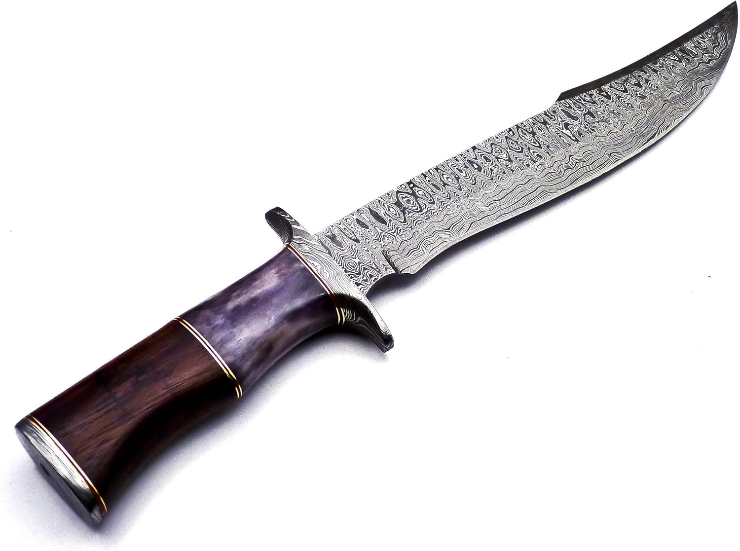 Experience a finely crafted Handmade Damascus Steel Knife designed for strength, balance, and performance. This full-tang knife is built with premium materials and traditional forging methods, making it suitable for outdoor use, collection, or gifting. Premium Damascus Steel Blade – Forged from 1095/15N20 alloy steels with 176 true layers, delivering exceptional durability, sharp edge retention, and a striking pattern unique to every blade. Rock-Solid Construction – Features a thick 10-inch blade with an overall length of 15 inches and a 5-inch ergonomic handle for a secure grip. Distinctive Handle & Guard – Crafted from natural marindi wood and bone, complemented with a Damascus steel guard and pommel for both function and style. Professional Hardness & Sharpness – Blade hardness rated at HRC 58–60, hand-sharpened for a reliable edge suitable for precision cutting. Durable Leather Sheath – Comes with a handmade leather sheath for safe storage, protection, and convenient carry.