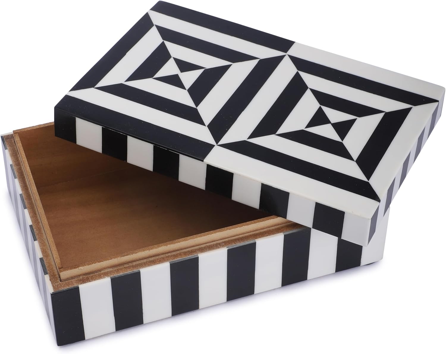 This Exclusively Curated 8x5x2 inch Black and White Geometric Pattern Multipurpose Box Available In Three Designs . these boxes in style with lampshade or candle holders as a centerpiece. Our decorative boxes are not just functional lid on the head but artistic made of Resin inlay. Box is something that can keep the smallest and important things that you might lose. We all need such boxes in our daily lives to store and remember things. -Available size 8x5x2 inch. The inner size is 7.25x4.25x1.5 inch, It's not Only Beautiful Outside But also has enough storage space Inside to store watch & jewelry, keys, accessories in the box to be handy. Ideal Gift for Loved One An ideal gift for someone who loves stylish accents in their home. These keepsake boxes are great Thanksgiving gifts, and Christmas gifts. Also suitable for Anniversaries, Birthdays, and more. -HANDMADE PRODUCT DISCLAIMER- Please Note That all our Home Décor Products are Meticulously Handmade, Please keep Away From Direct Sun-light or Strong Halogen Lights. The Product May be Cleaned With a Soft Dry Cloth. There Might be a Slight Variation in the Shade of the Actual Product and the Image Shown on the Screen, Due to the Screen Resolution and Photography effects.
