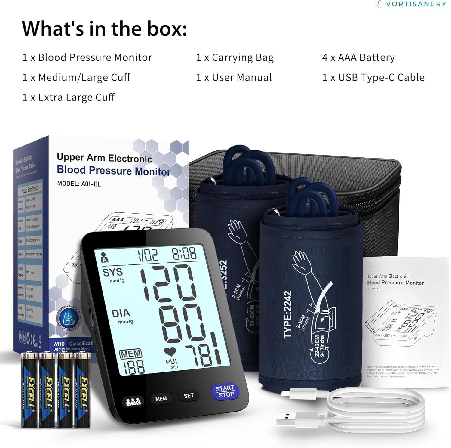 | Included Components | 4 AAA Batteries, BP Monitor, Carrying Bag, Medium/Large & X-Large Cuffs 9"-17" & 13"-21", USB Type-C Cable |