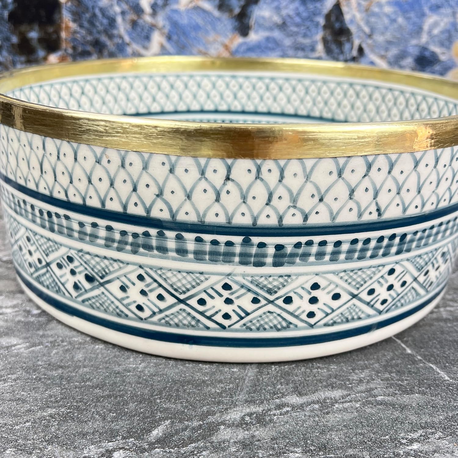 This blue-green ceramic vessel sink features delicate hand-painted geometric details finished with a subtle gold rim for a refined, contemporary look. The soft color palette brings calm and elegance to bathroom interiors. The smooth glazed surface is durable and easy to maintain, making it ideal for daily use. Designed for countertop installation, this round sink pairs beautifully with brass, chrome, black, or gold fixtures.