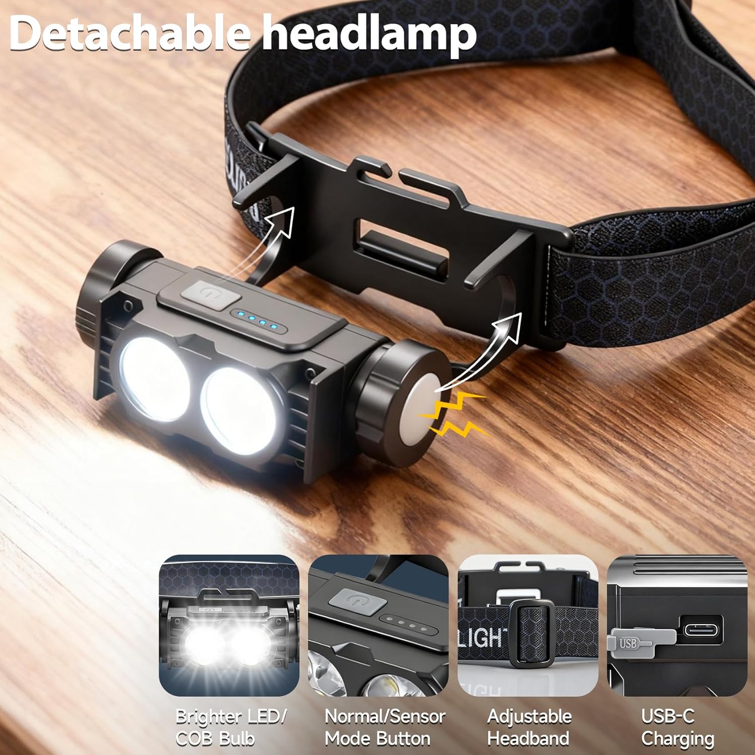 12pack Headlamp Rechargeable, 5000L Super Bright Light LED Rechargeable Headlight, 3 Modes, Detachable Flashlight & Waterproof Head Lamp for Adult, Running, Outdoor, Emergency, Hard Hat Light