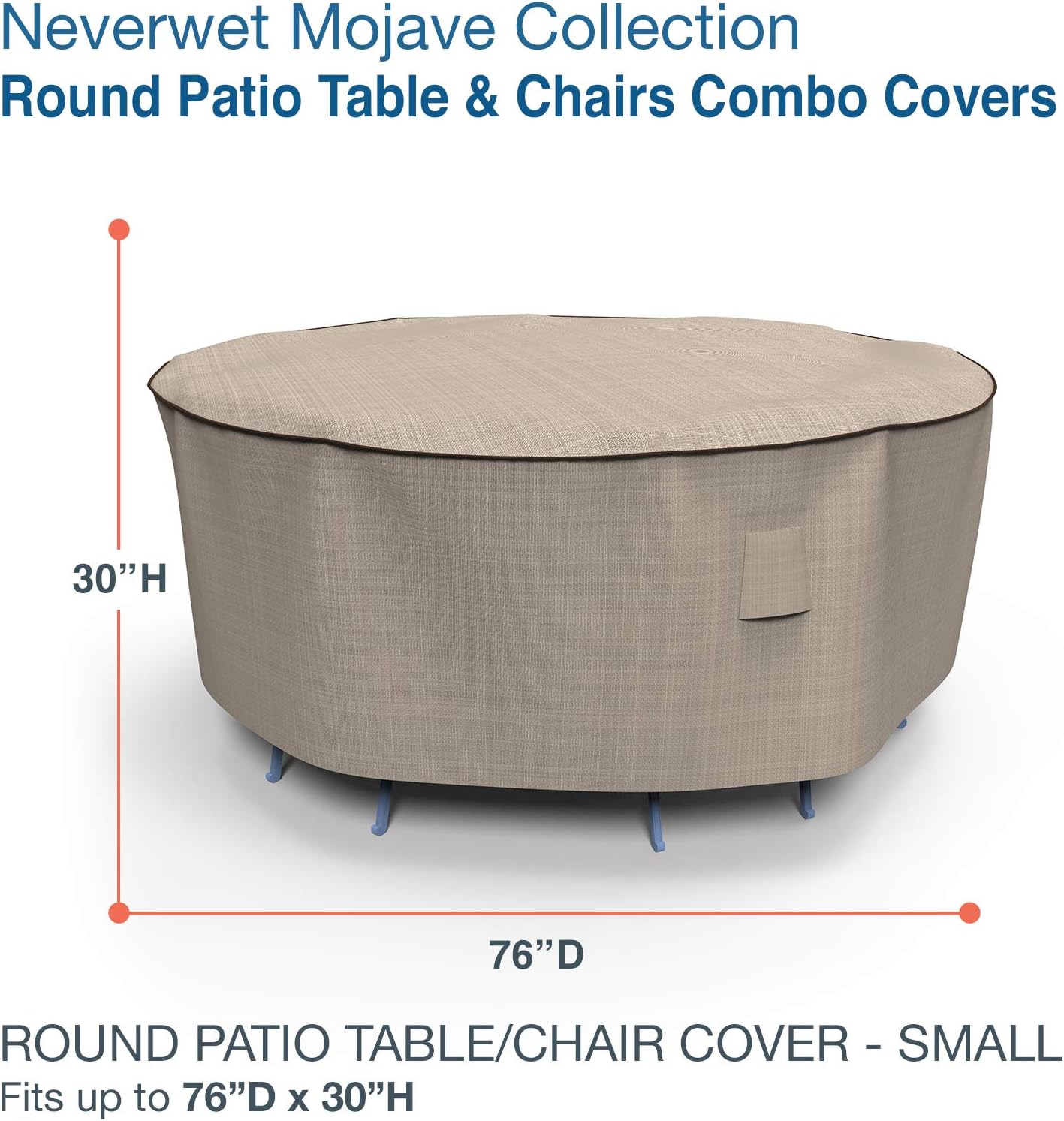 Our Round Patio Table and Chairs Combo Cover, Small provides stylish, durable protection for your outdoor patio furniture. Tastefully designed to match your patio set, this collection comes in an elegant black-and-ivory tweed pattern with dark gray piping and is contoured to fully cover your patio furniture. The StormBlock Mojave collection combines the long-lasting durability of our machine-woven 600 denier polyester with groundbreaking StormBlock technology and UV protection. With StormBlock technology, water rolls right off this cover, taking mud, tree-sap, dirt and bird droppings with it. Meanwhile, our strap and buckle system makes it easy to fasten your cover to the legs of your patio furniture for added security in windy weather conditions and sewn-in air vents create effective air flow. Cover Measures: 76" Dia. x 30" Drop.