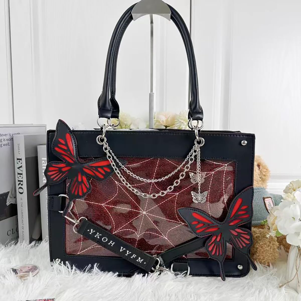 Spider Web Dark Academia Purses for Women【Butterfly Ita Bag】The butterfly tote bag looks exquisite, suitable for matching your gorgeous and exaggerated clothes to show your unique style.【Pin Display Bag】The back pocket of the is pin display bag is transparent, with enough space to display your favorite pins or souvenirs or anything else you want to display. There are also two butterfly decorations on the pin display tote bag, which is realistic and beautiful, lifelike.【Adjustable Shoulder Strap】This pin bag is practical and functional. The shoulder strap is detachable and adjustable, and can be used as a crossbody bag or a shoulder bag. The interior is spacious and can hold iPads and books. The two handle straps can be detached freely.
