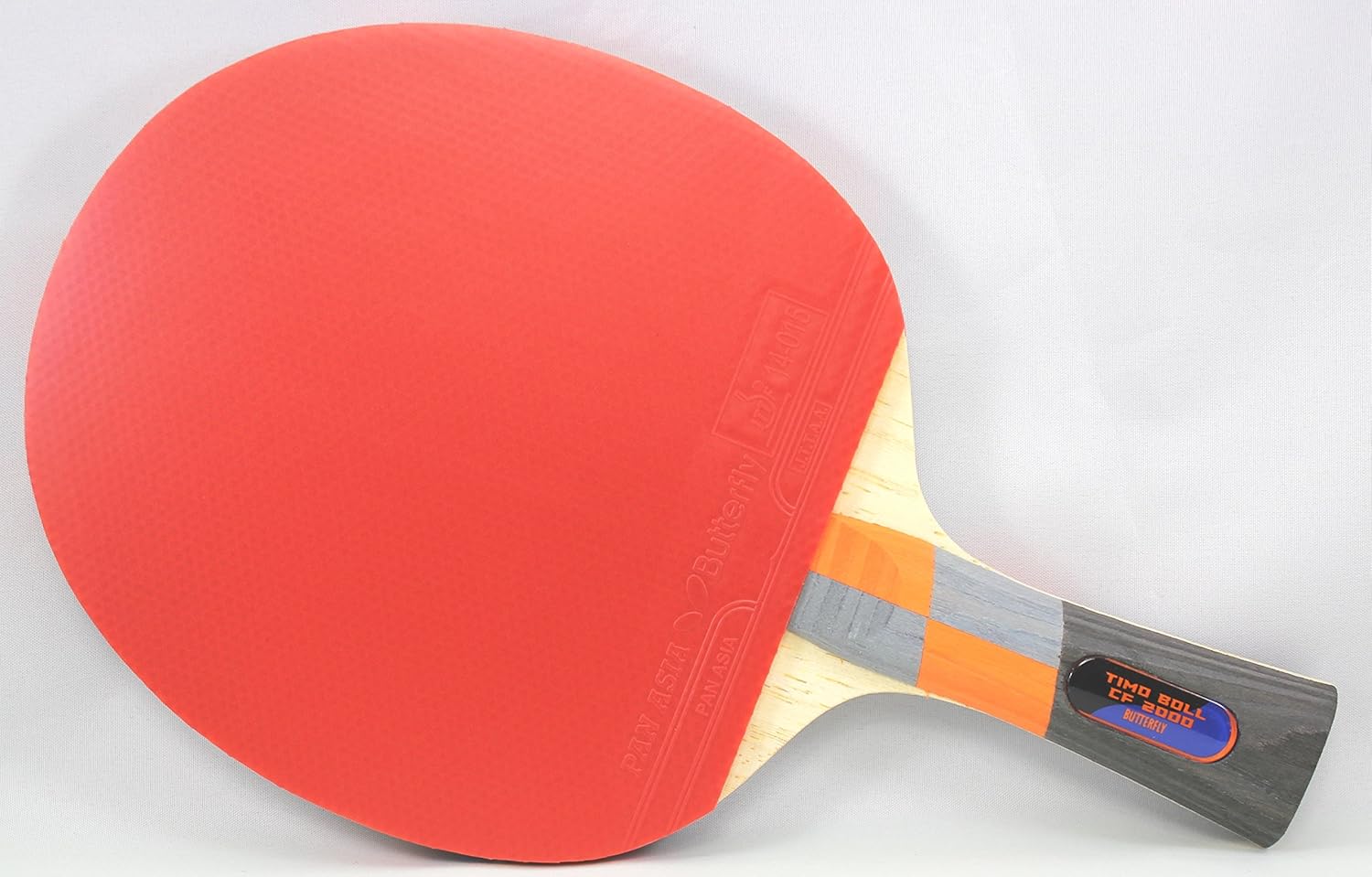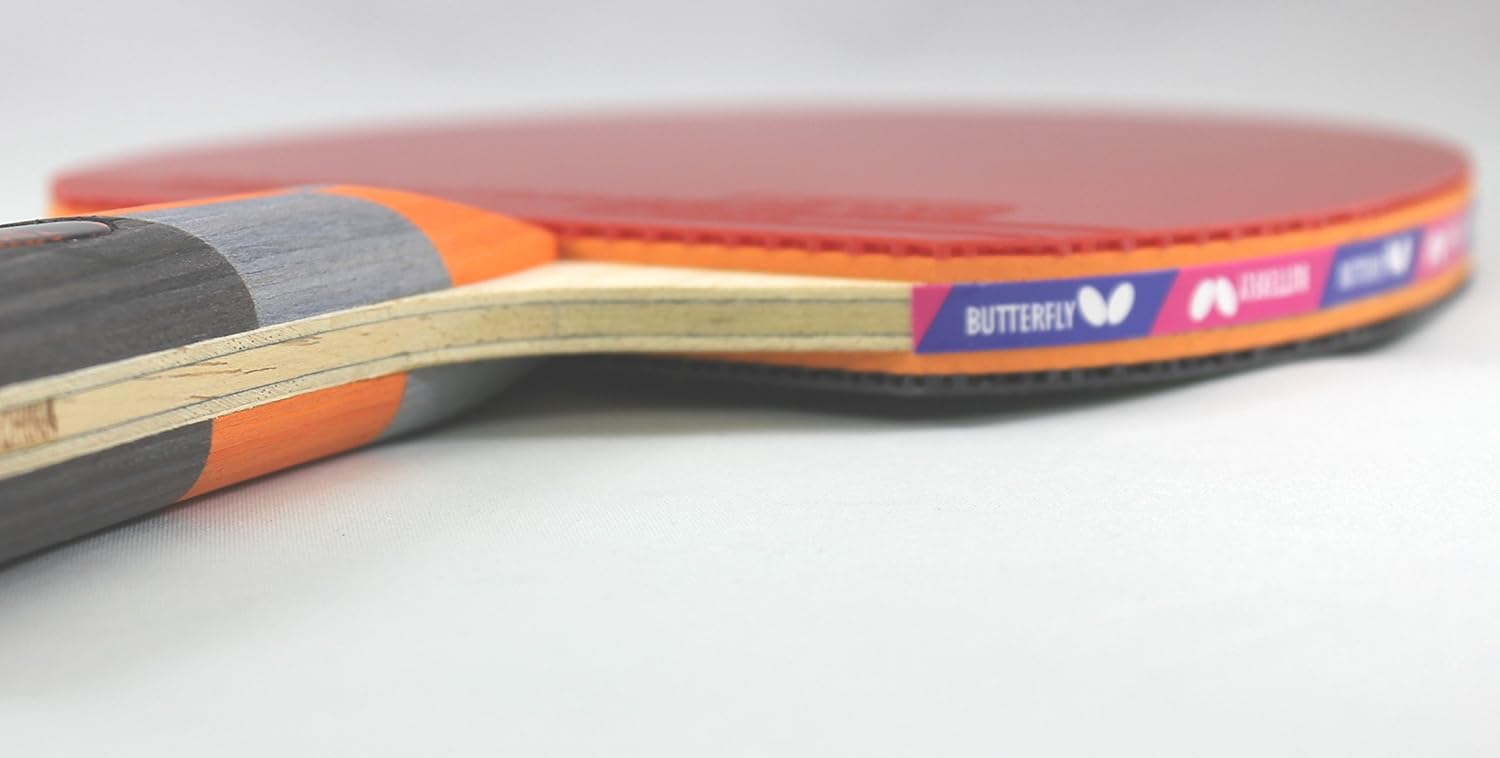 The Timo Boll CF table tennis racket by Butterfly Table Tennis is a great quality ping pong paddle that is made with wood and 2 layers of carbon that provide a large sweet spot and power when striking the ping pong ball against your opponent. The 1000 and 2000 ping pong paddle models only differ by handle color designs. Both are premium table tennis rackets that can be used in ping pong tournaments or at home. The Pan Asia table tennis rubber and a max thickness sponge layers give extra speed and spin that is needed to dominate the ping pong competition. Both table tennis rubbers are red and black high quality table tennis rubber sheets making it International Table Tennis Federation - ITTF approved for competitive table tennis tournaments. Both models have a table tennis racket handle with a flared design, which is narrower at top and wider at bottom. It offers superior grip for competitive ping pong matches. The shakehand style table tennis racket is stylish and makes for an ergonomic table tennis paddle. The flared handle design has been the preferred choice of table tennis players around the world. Butterfly table tennis rackets are also the most preferred rackets by table tennis professionals around the world.