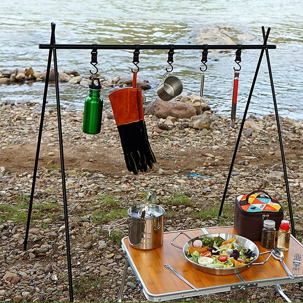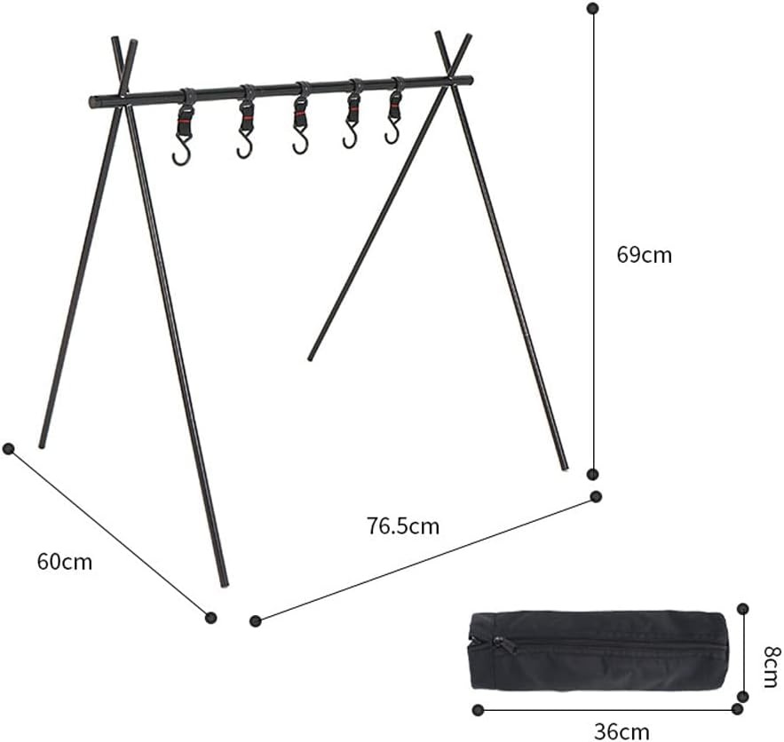 Camping hanging rack with 5 pieces hooks and 1 piece carrying bag Color: black Two Size: - Large: 101cm x 80cm x 101.5cm (39.76 x 31.49 x 39.9 inch) - Small:76.5cm x 60cm x 69.5cm (30.11 x 23.62 x 27.36 inch) Weight: 800g (large) / 650g(small) Material: Plastic steel and Aluminum alloy Lightweight and portable, with no rusting easily The rack is foldable in a small size, can be put in a storage bag, portable to bring it anywhere.