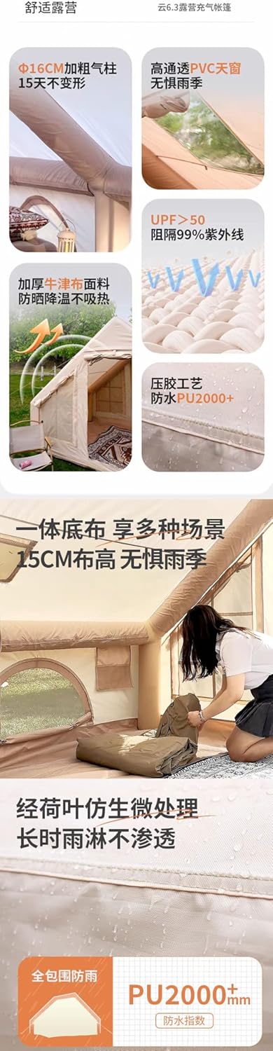 This inflatable tent is made of high-impact environmentally-friendly 420D Oxford fabric material and is equipped with an inflatable system, making it ideal for camping, outdoor activities and more. Features include: Fast inflation with a cylinder, 5 to 10 minutes to inflate it. Portable Design: Compact and easy to carry. Wind and rain protection: protects against wind and rain. 【420D OXFORD】 Waterproof PU3000mm,UPF50+ protection provides excellent sun protection and UV protection. 【Large Inflatable Camping Tent for 4-6 People】This inflatable tent house measures 9.8ft x 6.9ft x 6.4ft and provides about 67.85sq. ft. It comfortably accommodates 4 people to sleep and holds 6 people for activity, perfect for family camping trips. Note: For best results, we recommend that you use it as a sleeping space for 2-4 adults, or for 2 to 3 children. Hot Tent Jack with Stove Opening: This inflatable tent comes with a specially designed stove opening, so you can safely use a wooden stove for heating or cooking in the cold weather without worrying about the build-up of smoke. Quick Set Up Inflatable Tent in 5 Minutes: The inflatable camping tent features an innovative inflated bridge frame that does not require complicated poles. Easy to set up and store. It comes with a high pressure quick inflation pump so you can prepare the tent in 5 minutes. Compared to traditional camping tents, it is easier to set up and faster