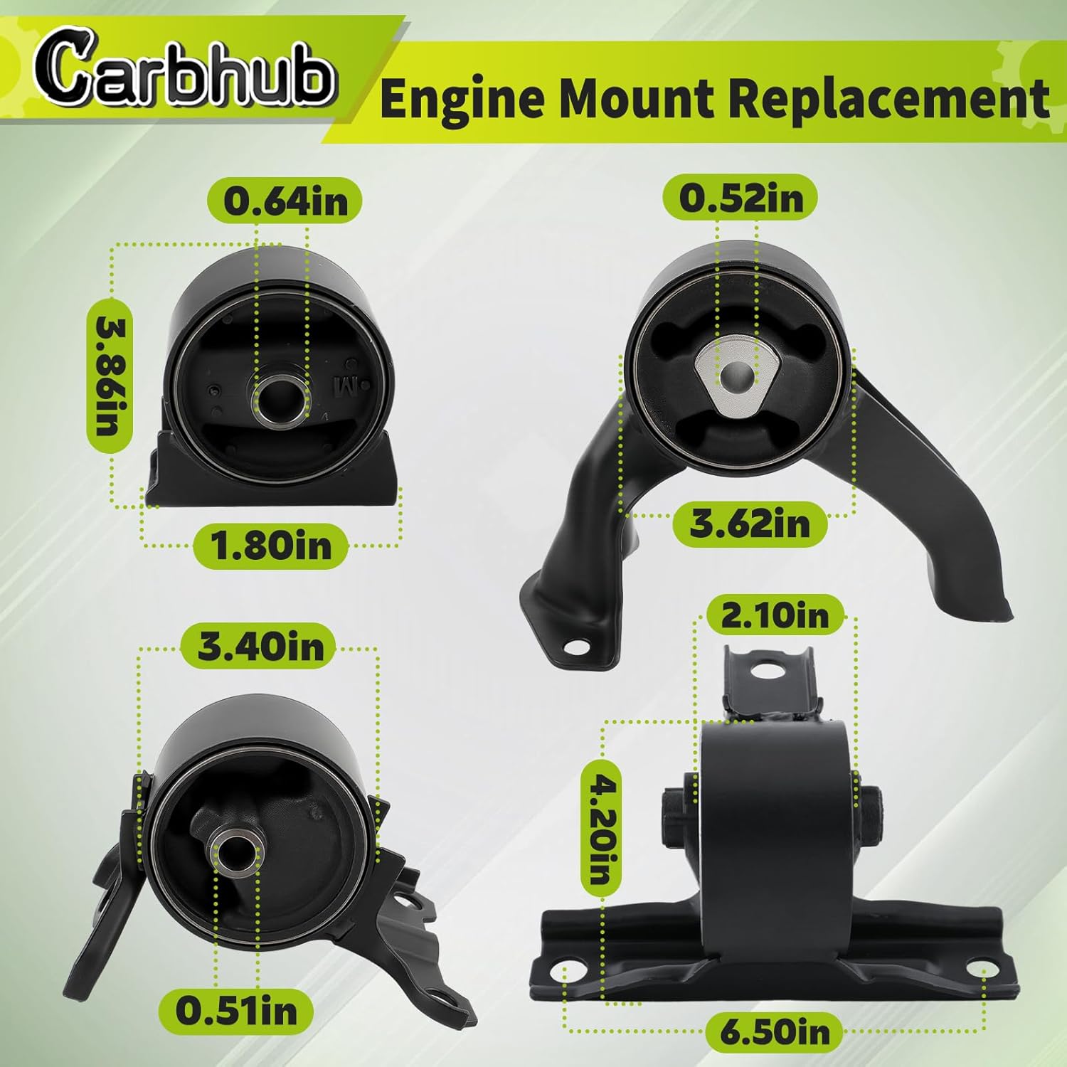 Replacement Part Number: 68032586AF, 68032586AA, 68032586AB, 68032586AC, 68032586AD, 68032586AE 05105499AC, 05105499AD, 05105511AC, 05105511AE, 5105667AC, 5105489AF, 5105489AK EM3130, EM3131, EM3134, EM3145, MN101574, MK5416, MK5415, MK5417, MK5418 A5415 A5416, A5417, A5418, 3130, 3131, 3134, 3145, 5416, 5415, 5417, 5418 Fitment: Dodge Caliber Series: 2009-2012 Dodge Caliber L4 2.4L Automatic Transmission Engine & Transmission Mount Kit 2007-2008 Dodge Caliber L4 2.4L Front Wheel Drive Automatic Transmission Engine & Transmission Mount Kit 2007-2012 Dodge Caliber L4 2.0L Automatic Transmission Engine & Transmission Mount Kit J eep Compass Series: 2014-2016 J eep Compass L4 2.4L Front Wheel Drive Automatic Transmission Engine & Transmission Mount Kit 2009-2013 J eep Compass L4 2.4L Automatic Transmission Engine & Transmission Mount Kit 2007-2008 J eep Compass L4 2.4L Front Wheel Drive Automatic Transmission Engine & Transmission Mount Kit 2007-2016 J eep Compass L4 2.0L Automatic Transmission Engine & Transmission Mount Kit J eep Patriot Series: 2014-2016 J eep Patriot (MK) L4 2.4L Front Wheel Drive Automatic Transmission Engine & Transmission Mount Kit 2009-2013 J eep Patriot (MK) L4 2.4L Automatic Transmission Engine & Transmission Mount Kit 2007-2008 J eep Patriot (MK) L4 2.4L Front Wheel Drive Automatic Transmission Engine & Transmission Mount Kit 2007-2016 J eep Patriot (MK) L4 2.0L Automatic Transmission Engine & Transmission Mount Kit Package Including: 1 x Front Motor Mount: A5416 / 5416 / MK5416 1 x Front Right Motor Mount: A5415 / 5415 / MK5415 1 x Rear Motor Mount: A5417 / 5417 / MK5417 1 x Transmission Mount: A5418 / 5418 / MK5418