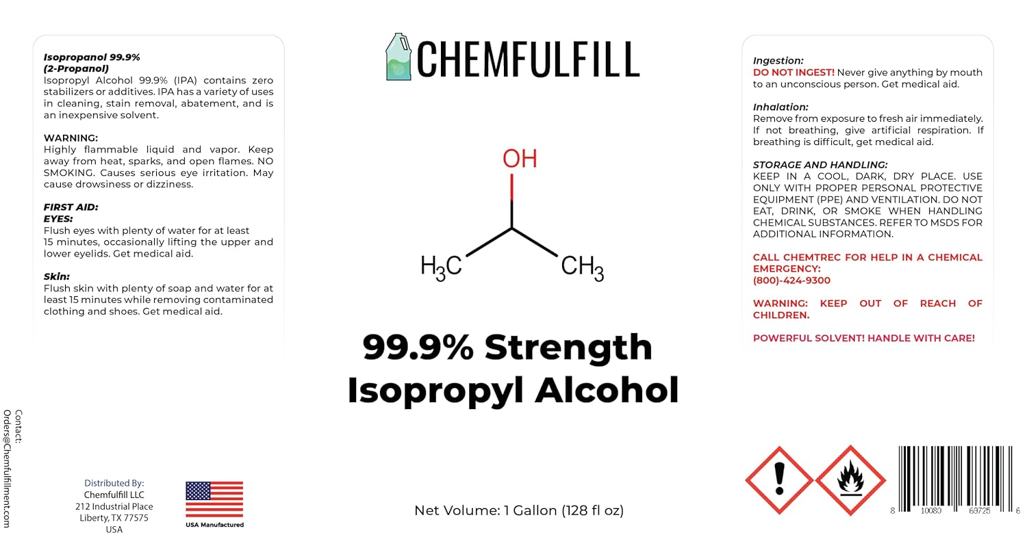 Chemfulfill 99.9% Isopropyl Alcohol Chemfulfill's industrial grade 99% isopropyl alcohol is the ultimate cleaning and disinfecting solution for your business. Its high alcohol content makes it highly effective at cleaning a variety of surfaces, including metal, plastic, and glass. This industrial-strength isopropyl alcohol is perfect for use in manufacturing and production environments, where it can be used to clean and sterilize equipment and machinery. Its fast-evaporating formula leaves no residue behind, making it a great choice for use on sensitive electronic components. Our Chemfulfill brand isopropyl alcohol comes in a convenient 1-gallon jug among many other sizes, making it easy to store and use in large quantities. It is also easy to apply, with a clear, colorless liquid that evaporates quickly without leaving any residue behind. Choose Chemfulfill for all of your industrial cleaning and disinfecting needs. Order our 99% isopropyl alcohol today and keep your workspace clean and safe.