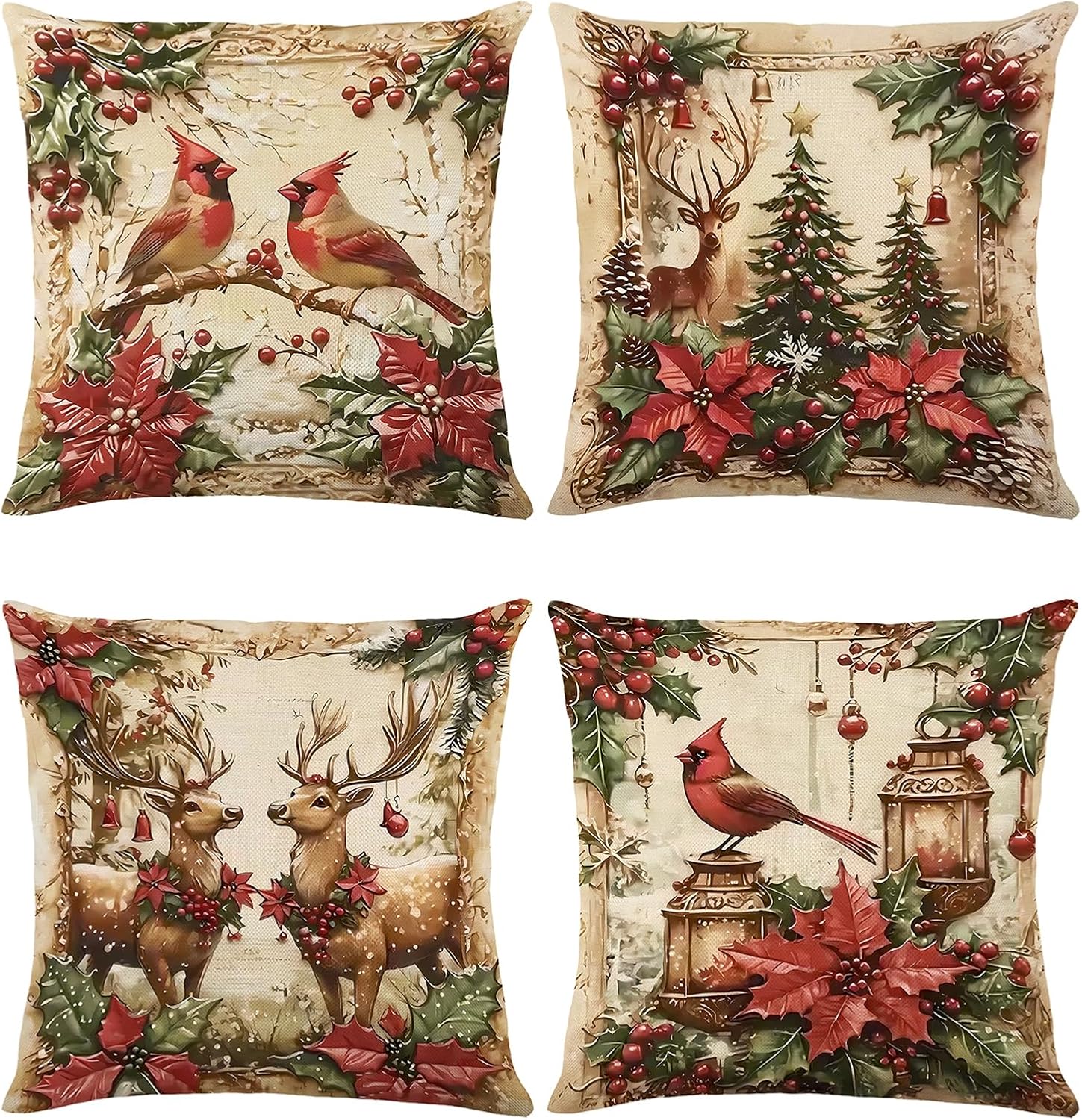Transform your home into a cozy Christmas wonderland with our Christmas Retro Linen Throw Pillow Covers! This set of 4 pillow covers features unique vintage-inspired patterns that capture the true essence of the holiday season. Each cover showcases an exquisite design: The snowman, with a black hat dusted by “snowflakes”, a cheerful red bird resting on its shoulder, and a classic red-and-white checkered scarf, brings playful charm. Its rosy cheeks and red mittens add a touch of cuteness that warms the heart. The adorable deer, with delicate antlers and a soft brown spotted coat, stands beside a large, glittering red Christmas ball. A tiny red bell around its neck jingles with holiday joy. The elegant bells, wrapped in a red, white, and gold striped ribbon, are adorned with vibrant red berries. They echo the festive spirit with every detail. The friendly Santa Claus, with a fluffy red hat, a kind smile, and a thick white beard, peeks out from among holly leaves and berries, spreading Christmas cheer. Crafted from high-quality linen, these covers are not only soft and durable but also feature a vintage washed finish. The natural texture of linen blends perfectly with the retro patterns, creating a warm and nostalgic atmosphere. Whether you’re decorating your living room sofa for a family gathering, adding a festive touch to your bedroom, or sprucing up a Christmas party venue, these pillow covers are the ideal choice. They work beautifully beyond the holiday season too – their timeless retro style complements rustic and vintage-inspired home decors all year round. Give the gift of Christmas charm to your loved ones, or treat your home to a festive upgrade. Embrace the warmth and nostalgia of the season with our Christmas Retro Linen Throw Pillow Covers!