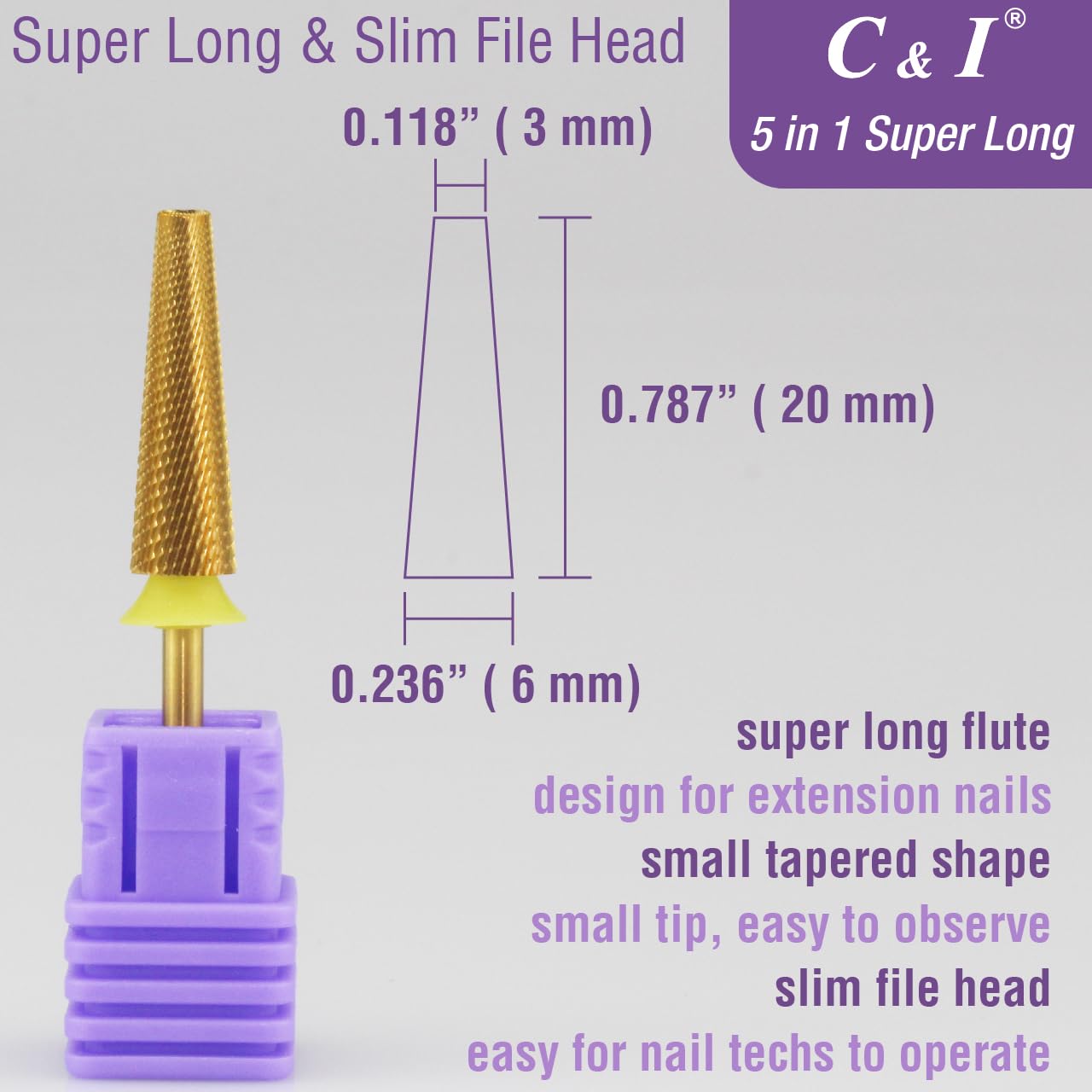 C&I Professional Nail Drill Bit Super Long 5 in 1 Multi-function Efile Slim Version Special Design for Extension Nails, Fake Nails, Nail Tips, Acrylic Nails, Hard Gel, Dip Powder Nail Supplies for Nail TechsNail Techs Must Haves Massive file-teeth sizes for choose. For acrylic gels, UV gels, fake acrylic nails, or other hard gels, recommend size 3XC, XXC, XC or C (Coarse). For normal nail gels, size M or F could help you. For base gels, remain gels, size XXF (Double Fine). And size XXF, also could be used as nail buffer for natural nails to do preparation or prep nails Cuticle Remove -Rounded Cut: A cuticle bit, the top corner of the tapered flute is designed to rounded corner with file-teethNail Bit is made of Tungsten Carbide. Titanium Nitride Coating, help to extend the life of nail file. Shank: 3/32” (2.35 mm), adapt most of e file machines. Professional nail supplies for nail techs.