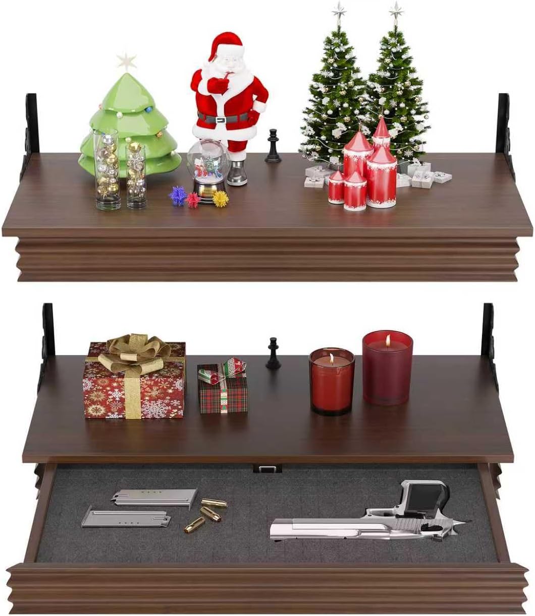 Secret Gun Safe Concealment ShelfThis isn't just a hidden compartment; it's a professionally designed storage system that offers tailored protection for your firearm and valuables, seamlessly integrated into stylish, space-saving home decor. Product Specification:Color Options: Black/BrownMaterial: Solid WoodProduct Dimension: 23.6"W x 11.8"D x 3.3"HPackage Included: 1 x Gun Rack for Wall; 1 x Assembly Kit; 1 x InstructionAssembly Required: Yes (easy)Features:Automatic Induction LockPre-cubed Foam for organizationHidden gun drawerEasy Installation & Easy AccessExcellent piece of furniture