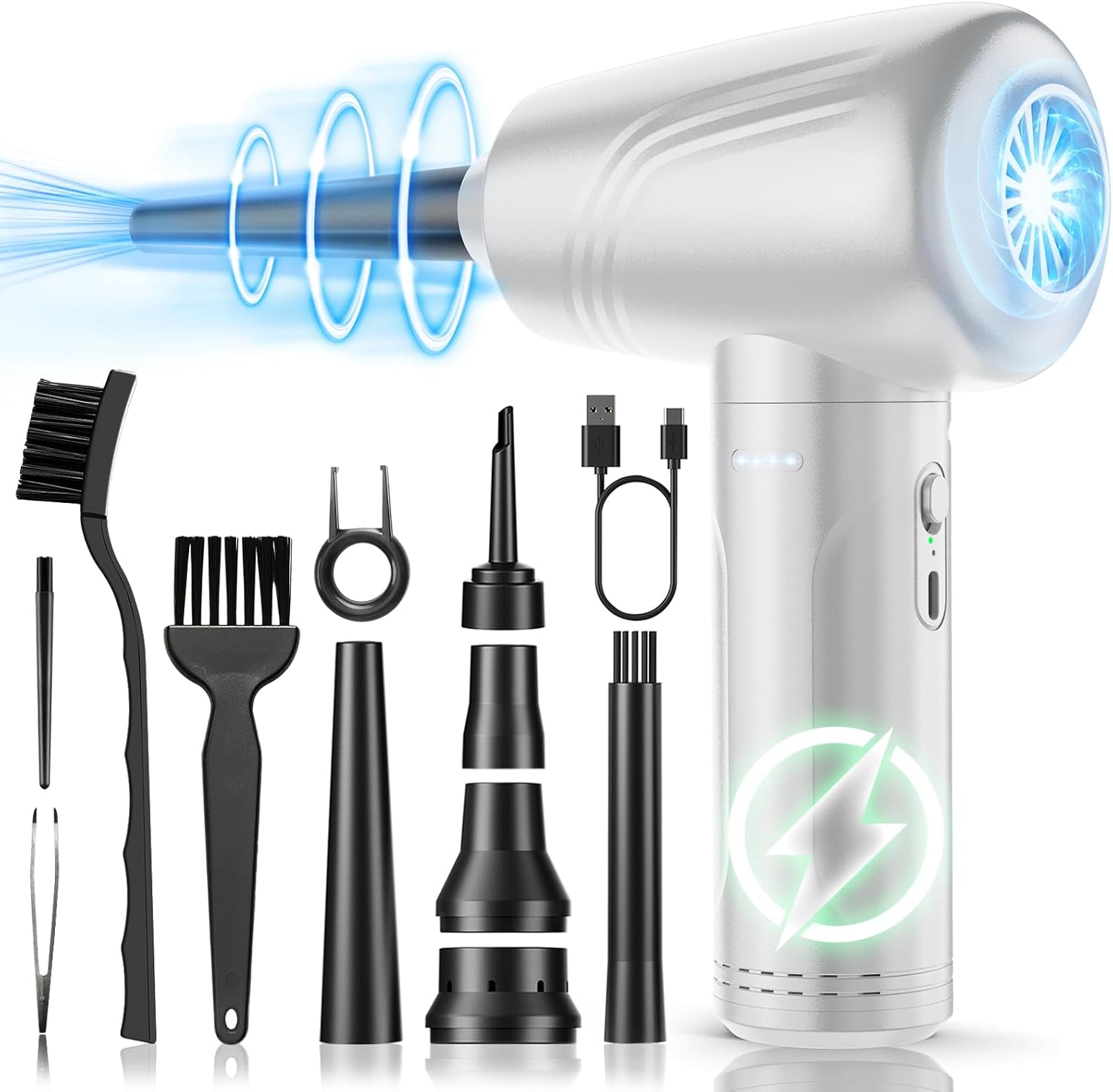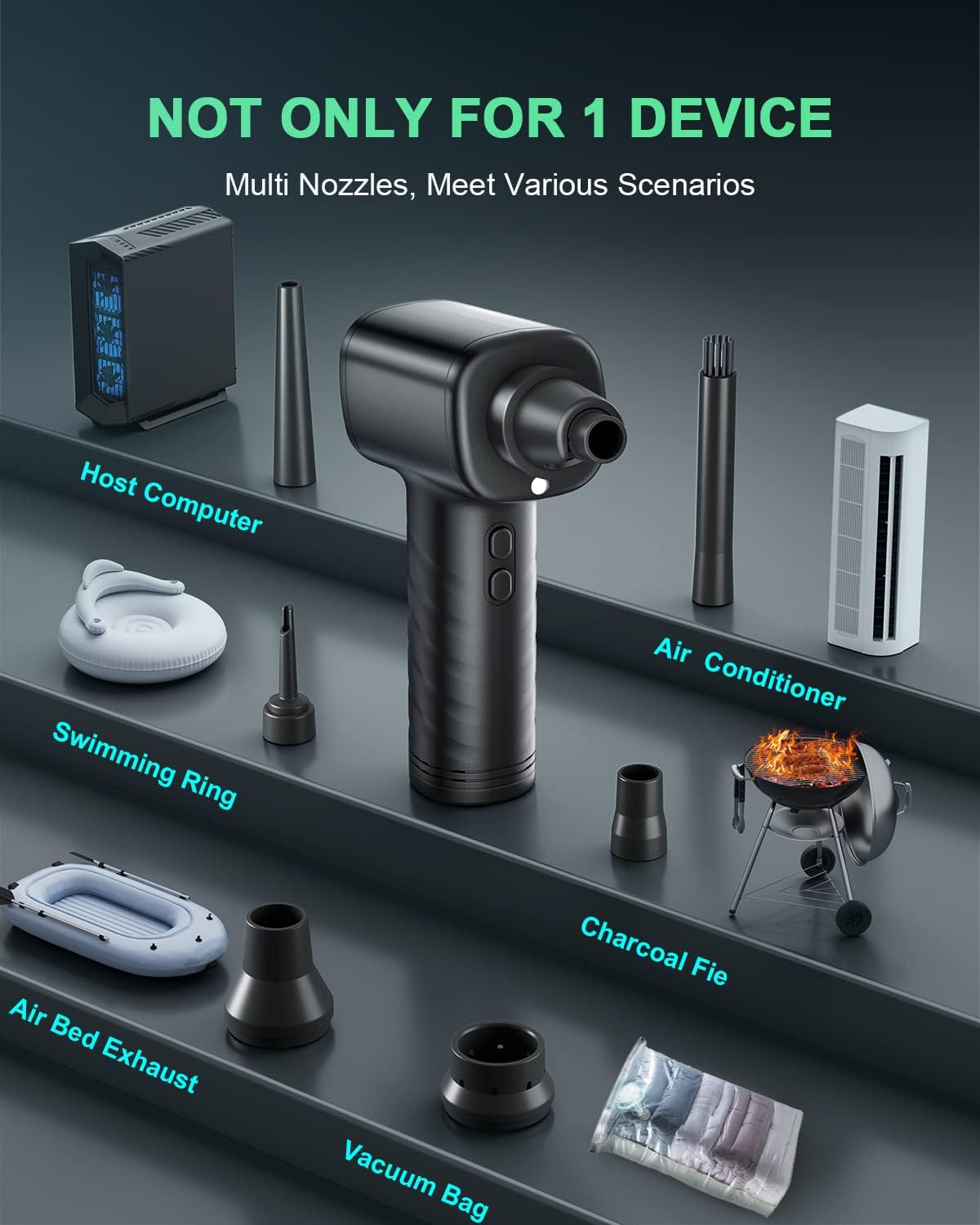 Compared with compressed air can, our cordless air duster do not produce chemicals, liquids or ice during the cleaning process. It protects your electronics from liquids. The air blower be used multiple times, it saves you money and protects the environment.