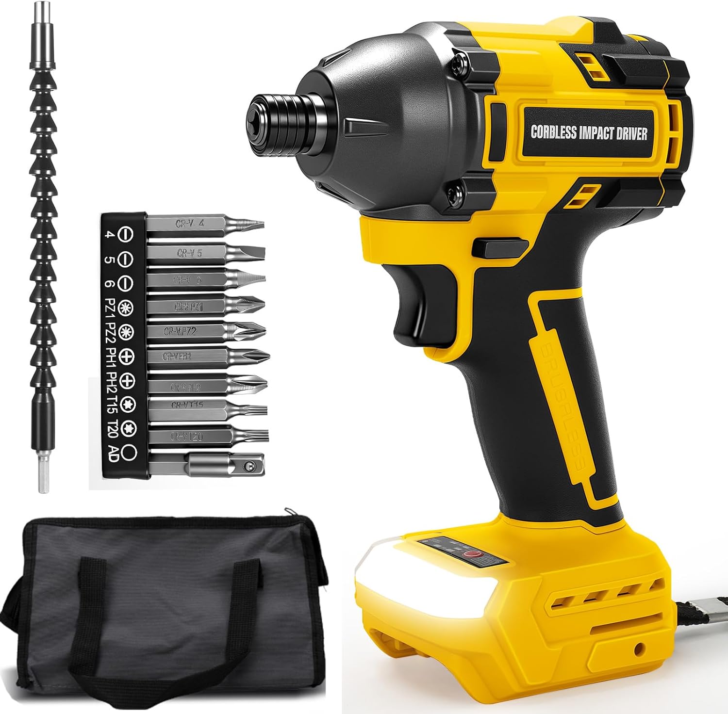 Product Parameters: Product Name: 1/4" Impact Driver Torque: 280 N.m/2500 In-lbs Motor: Brushless Motor Motor Speed: Rotation: 0–1300 RPM/0-1800 RPM Impact Frequency: 0-1500 BPM/0-2300 BPM Packing List: 1 x Brushless Impact Driver 1 Set Drill Attachments 1 x Storage Bag