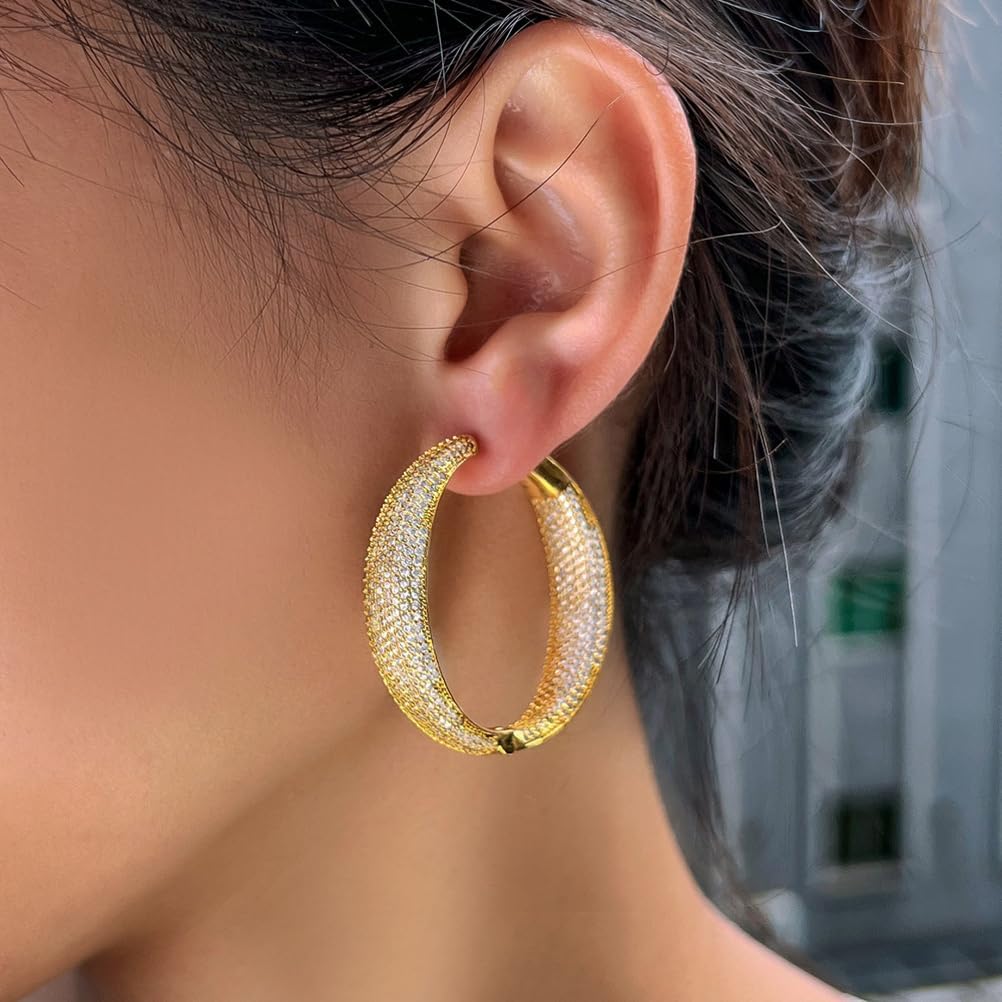 Make a dazzling statement with these luxurious round hoop earrings, featuring an impressive array of 532 meticulously paved cubic zirconia stones that catch and reflect light from every angle. The sophisticated silver-plated design measures 4cm in height and 1cm in width, offering the perfect bold yet elegant proportion. These stunning hoops showcase a high-polish finish and secure easily with a practical buckle closure. Perfect for special occasions including weddings, parties, and formal events, these earrings add a touch of glamour to any ensemble. The synthetic cubic zirconia stones are expertly set in a prong setting, creating a seamless surface of brilliant sparkle. The classic round hoop silhouette combines timeless style with contemporary luxury, making these earrings a versatile addition to any jewelry collection. Whether paired with an evening gown or elevating a casual outfit, these statement pieces are designed to capture attention and create lasting impressions.