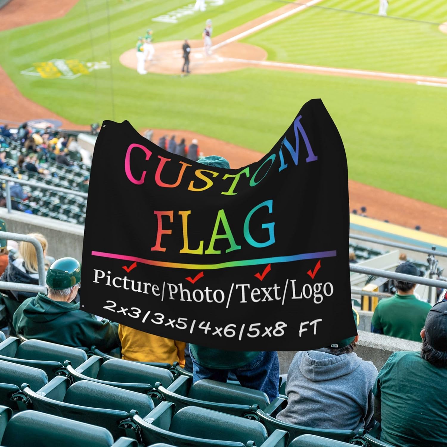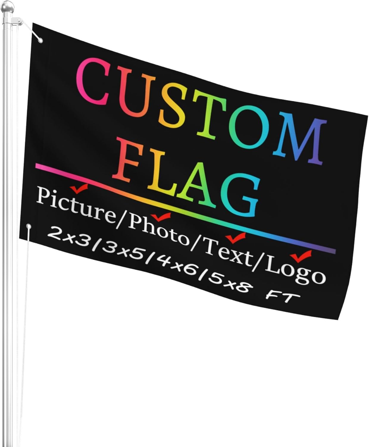 Stand Out with Our Premium Custom Flags! Tired of flimsy, one-sided flags that fade after a few uses? Our Custom Flags are here to revolutionize your display! Funny Flags Custom Banner Featuring double-sided printing, your design shines brightly from every angle, ensuring maximum visibility. Custom Flags Built with a durable 3-layer structure, our custom Flag personalized are tough enough to withstand wind, rain, and sun, making them perfect for both outdoor events and indoor decorations. Plus, the customizable flag metal grommets on both ends of the left side make hanging a breeze, saving you time and hassle. Unlike other flags that lose their vibrancy, ours customized flag are made with fade-resistant materials, so the colors stay bold and bright, even after prolonged sun exposure. Customize Flag With multiple size options—2X3FT(24X36inches/60x90cm); 3x5FT(36X60inches/90x150cm); 4X6FT(48X72inches/122x183cm); 5X8FT(60X96inches/152x244cm).—you can choose the perfect fit for any occasion, whether it's a small backyard party or a large outdoor event. Whether it's for your business, sports team, or special event, our custom flags combine strength, style, and convenience to deliver unmatched quality. Choose a flag that truly stands out—choose ours!