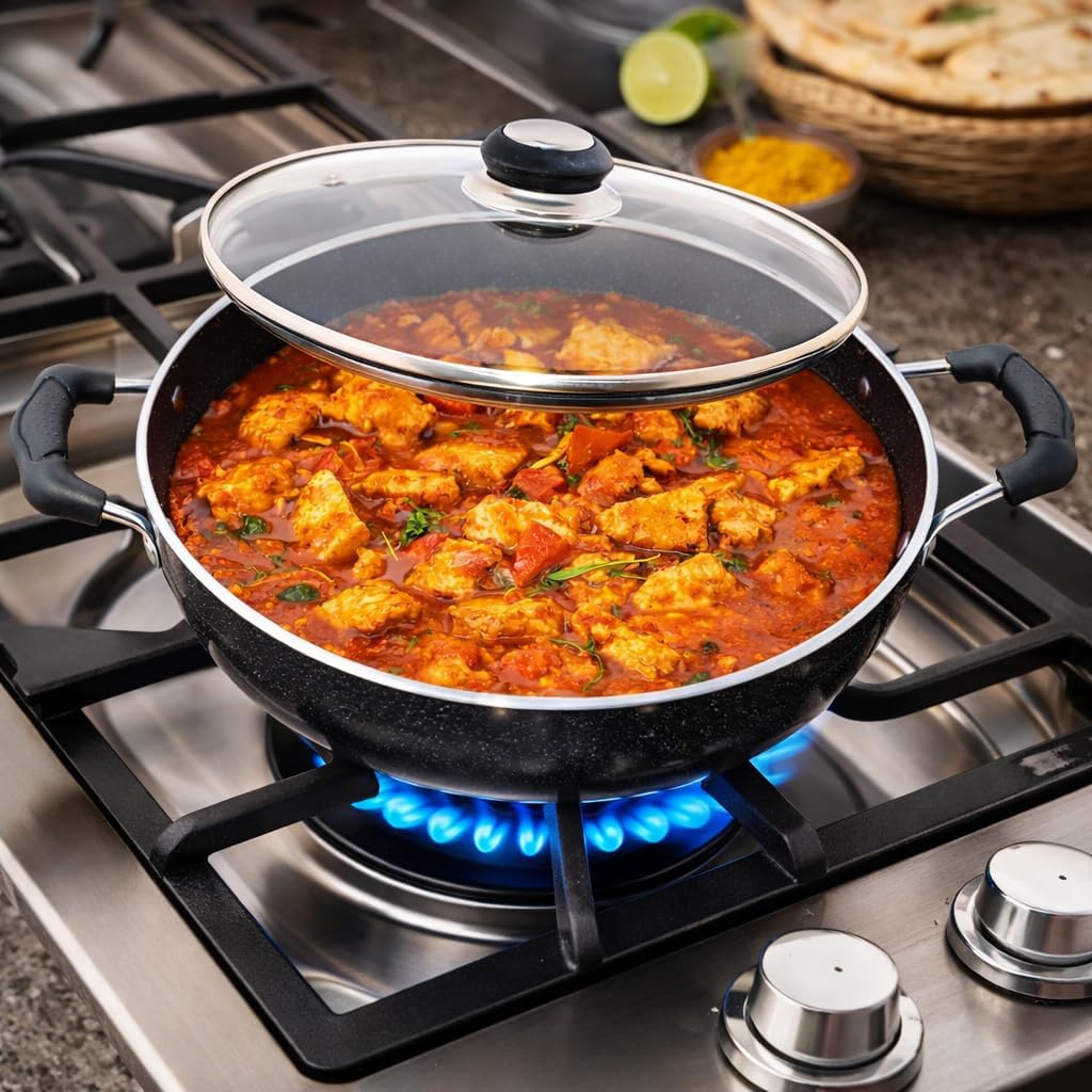 This kadhai is its non-stick coating, which allows for cooking with minimal oil or butter. This coating ensures easy release of food and facilitates quick cleaning after use. It typically comes with sturdy, heat-resistant handles that offer a comfortable grip and remain cool during cooking. Suitable for a wide range of cooking techniques, including sautéing, frying, shallow frying, and even deep frying due to its deep, curved shape. It can handle a variety of ingredients, from vegetables to meats and seafood. Requires less oil, making it ideal for health-conscious cooking. Lightweight and easy to handle, enhancing user comfort and usability. Use wooden or silicone utensils to avoid damaging the non-stick coating. Hand wash with a soft sponge and mild detergent to preserve the non-stick properties. Avoid using metal scrubbers or abrasive cleaners that can scratch the surface.