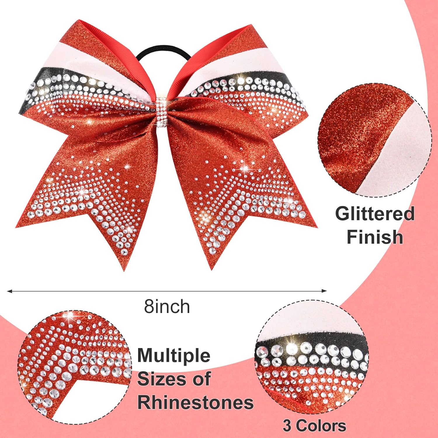 Sparkling Design: The cheer bows feature a dazzling combination of glitter and iridescent rhinestones, creating a radiant, multi-dimensional look that shines from every angle.