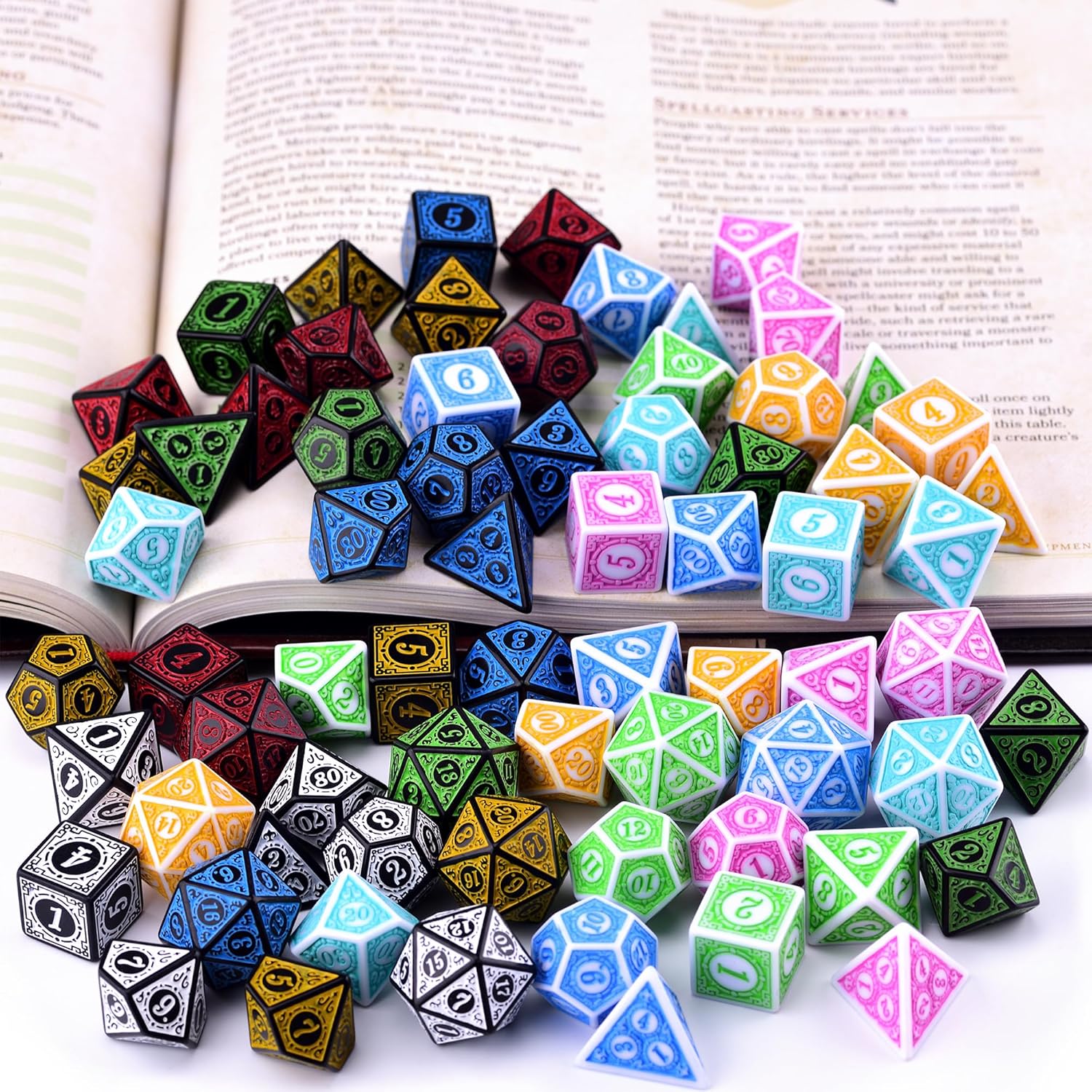 Package Includes: 70 * Retro polyhedral dice 1 * Drawstring bag Specification: Height of dice: 16.2 - 21.8mm Bag size: 5.5 x 7inches Tabletop Game Accessory: 10 complete polyhedral dice sets, each 7-piece set includes a d4, d6, d8, d10, d12, d20 and percentile d10, perfect for Dungeons and Dragons tabletop role-playing games and other board games, card games, miniature war games and math games. Due to the shooting light, screen display and other reasons, there is a certain color difference between the picture and the real object.