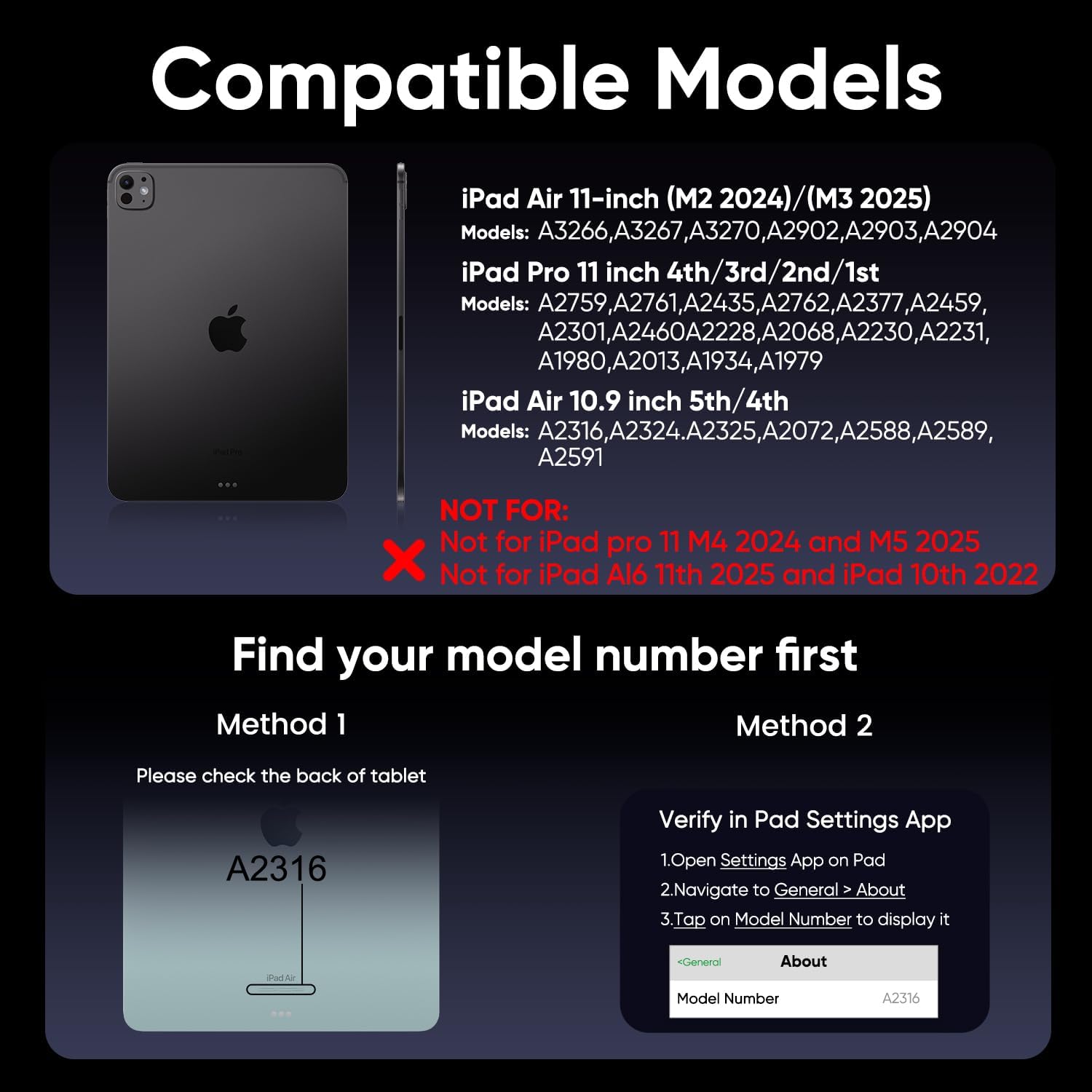 | Compatible Devices | iPad Air 11-inch (M4/M3/M2,2026/2025/2024), iPad Air 5th 10.9-inch(2022)/Air 4th 10.9-inch(2020), iPad Pro 11-inch 4th/3rd/2nd/1st gen (2018/2020/2021/2022) |