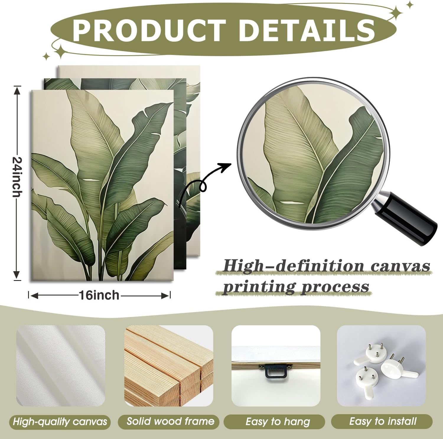 The Doqueodas three-piece tropical-themed wall hanging set brings the tranquility of tropical nature into your home, perfectly blending modern design with natural charm. Each piece is a 12x16-inch framed canvas painting, showcasing a high-resolution image of banana leaves. The lush green veins, soft color variations, and clean, neutral background draw the viewer's eye to the natural beauty of the leaves. The minimalist style avoids a cramped feeling, making it a versatile choice for various decorating styles, from a chic modern living room to a cozy bohemian bedroom. These pieces are securely mounted on a sturdy wooden frame, preventing warping and ensuring long-lasting durability. The ink locks in the vibrant details of the leaves, keeping the image clear and bright even in a sunny room. The matte canvas surface reduces glare, allowing for clear viewing from any angle. Pre-installed hanging accessories allow for easy installation in seconds—no measurements or tools required; simply hang it out of the box for quick and convenient installation. Beyond its beauty, this plant wall hanging creates a serene visual focal point. The natural leaf pattern brings a touch of tranquility to a busy space, making it ideal for an office (to relieve stress) or a bedroom (to promote relaxation). It also pairs perfectly with a variety of decorating elements, such as wooden shelves, jute rugs, or neutral-toned cushions, further enhancing its tropical, natural ambiance.As a gift, these printed paintings are both thoughtful and practical, making them ideal for nature lovers, new homeowners, or anyone looking to refresh their space with sophisticated and stylish decor. We always prioritize quality and customer satisfaction. Every set is inspected before shipping to ensure it arrives undamaged. If you encounter any problems, our team will provide a convenient refund or exchange service according to Amazon's guidelines. Infuse your home with a serene tropical charm by adding the banana leaf canvas painting to your cart today and transform your space with a modern, nature-inspired décor!